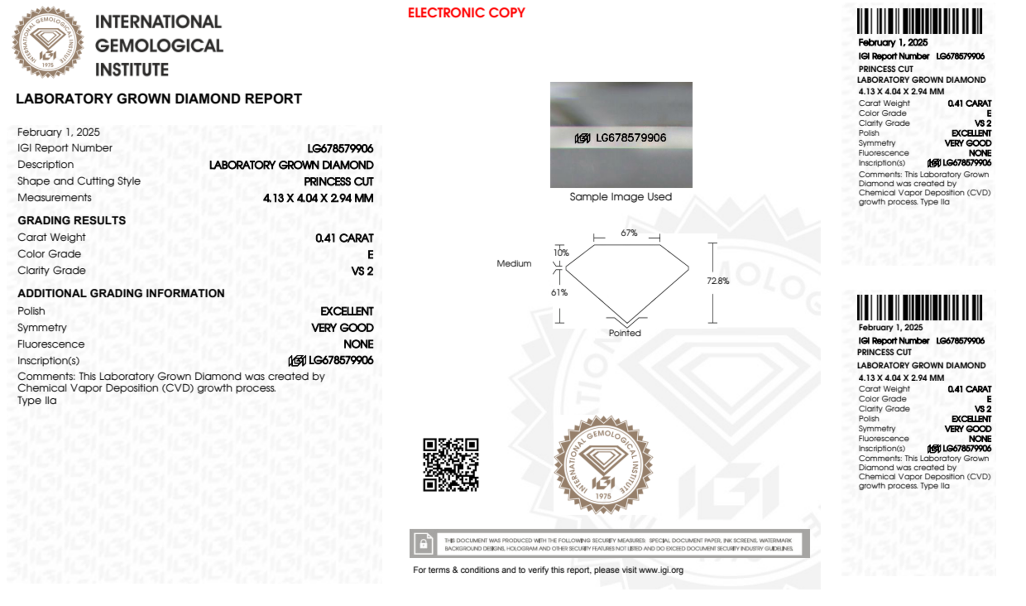 Your 0.41 carat Princess lab diamond is graded E color (Colorless), and you can read more about E color diamonds here.