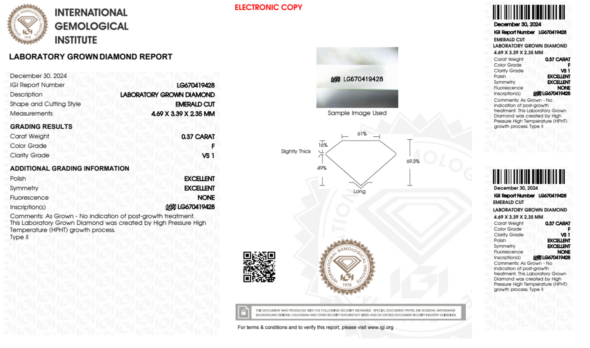 Your 0.37 carat Emerald lab diamond is graded F color (Colorless), and you can read more about F color diamonds here.