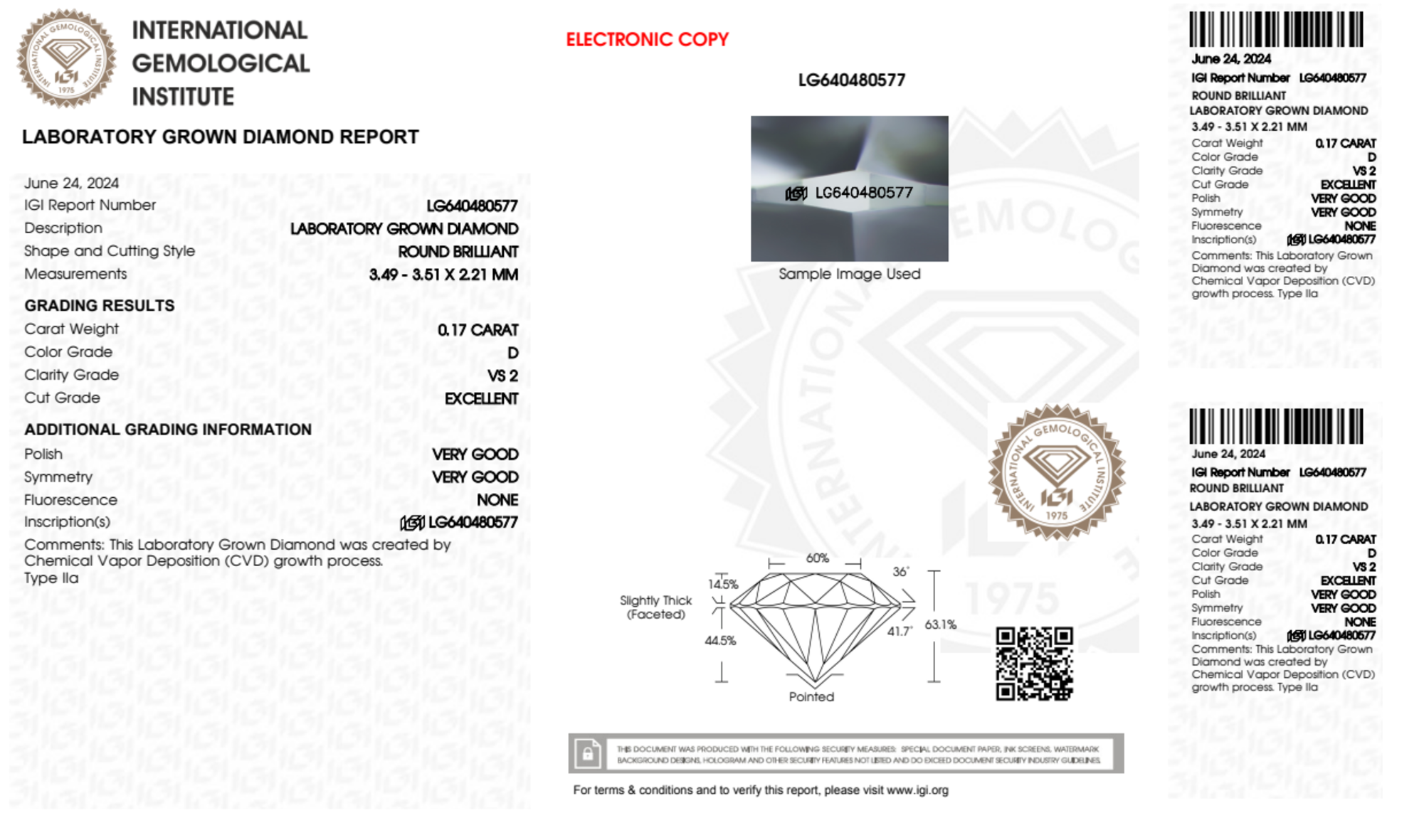 Your 0.17 carat Round lab diamond is graded D color (Colorless), and you can read more about D color diamonds here.