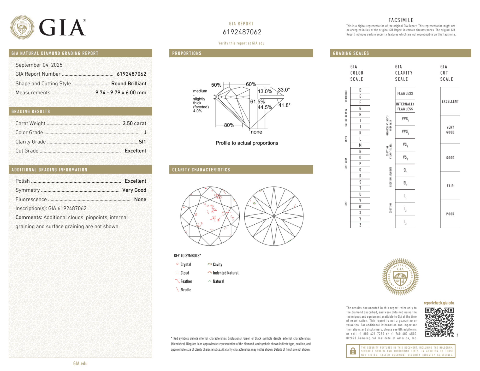 Your 3.50 carat Round natural diamond is graded J color (Near Colorless), and you can read more about J color diamonds here.