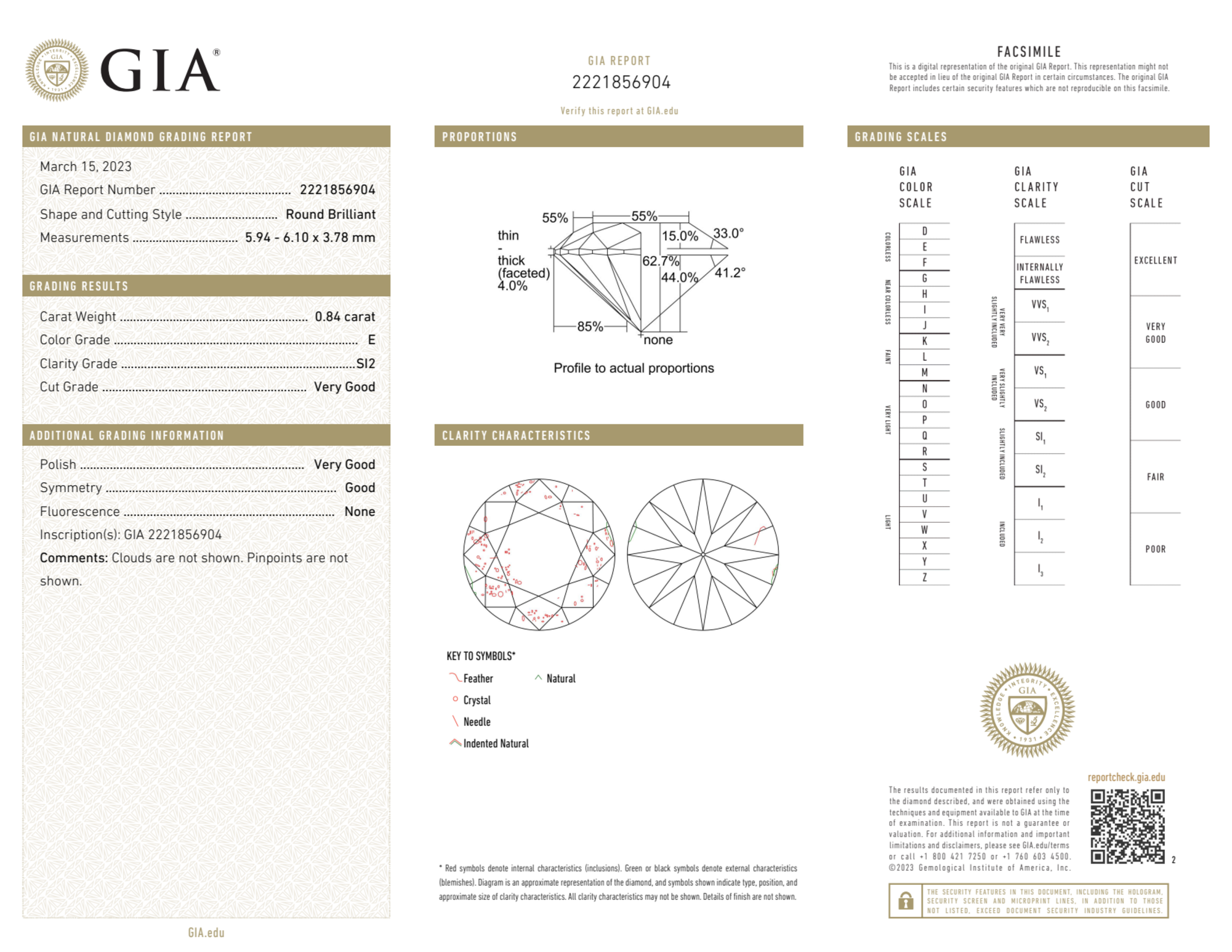 Your 0.84 carat Round natural diamond is graded SI2 clarity, which stands for Slightly Included 2. Read more about SI2 clarity diamonds here, or learn more about diamond clarity in general here.