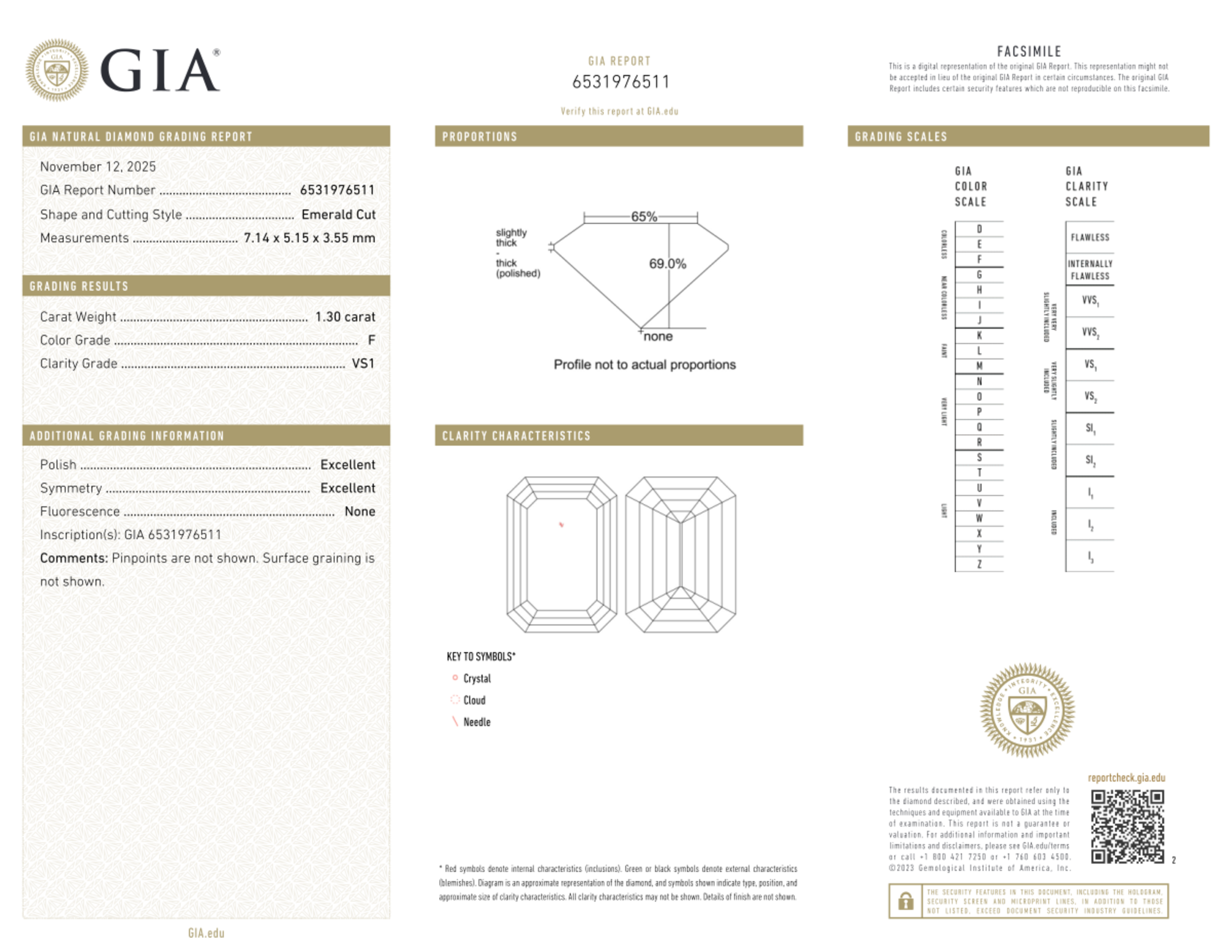 Your 1.30 carat Emerald natural diamond is graded VS1 clarity, which stands for Very Slightly Included 1. Read more about VS1 clarity diamonds here, or learn more about diamond clarity in general here.