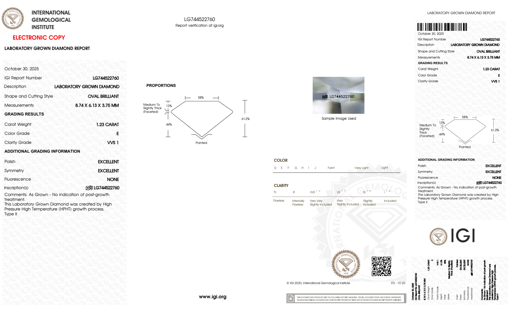Your 1.23 carat Oval lab diamond is graded E color (Colorless), and you can read more about E color diamonds here.
