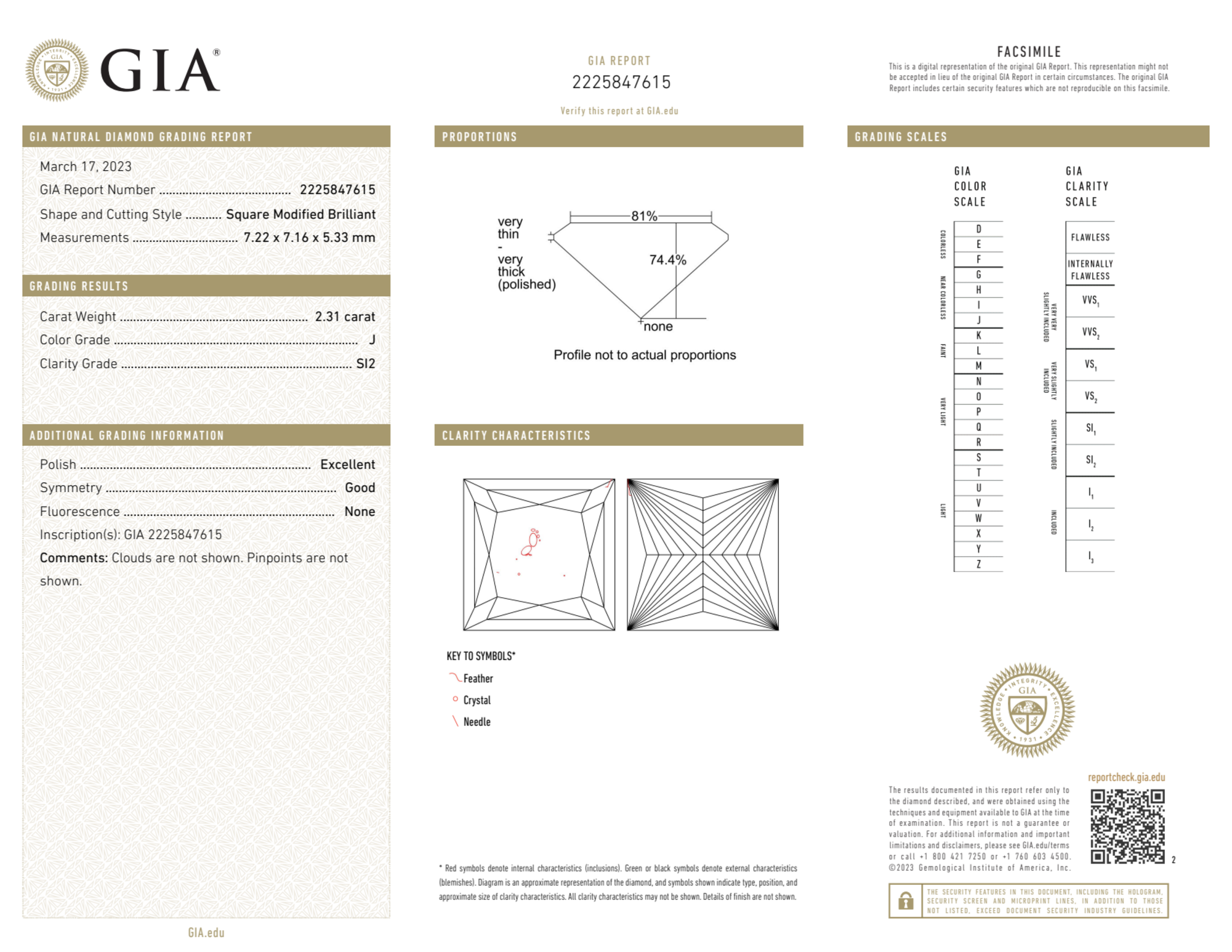 Your 2.31 carat Princess natural diamond is graded SI2 clarity, which stands for Slightly Included 2. Read more about SI2 clarity diamonds here, or learn more about diamond clarity in general here.