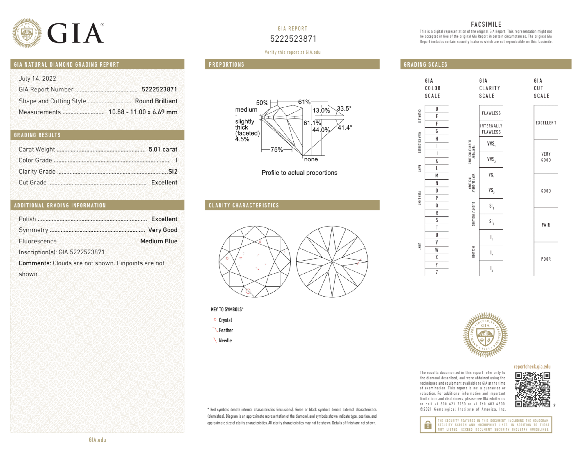 Your 5.01 carat Round natural diamond is graded SI2 clarity, which stands for Slightly Included 2. Read more about SI2 clarity diamonds here, or learn more about diamond clarity in general here.