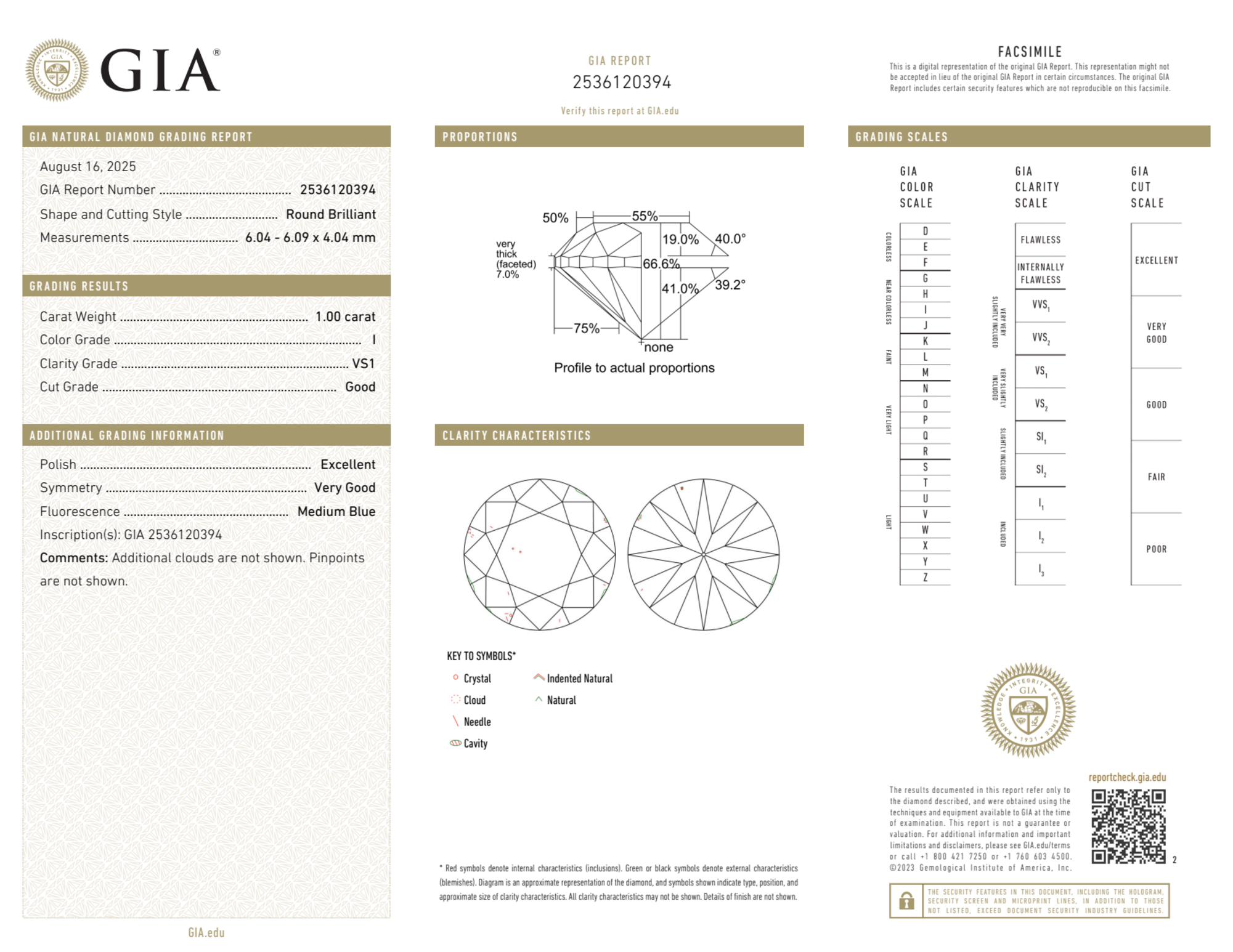 Your 1.00 carat Round natural diamond is graded VS1 clarity, which stands for Very Slightly Included 1. Read more about VS1 clarity diamonds here, or learn more about diamond clarity in general here.