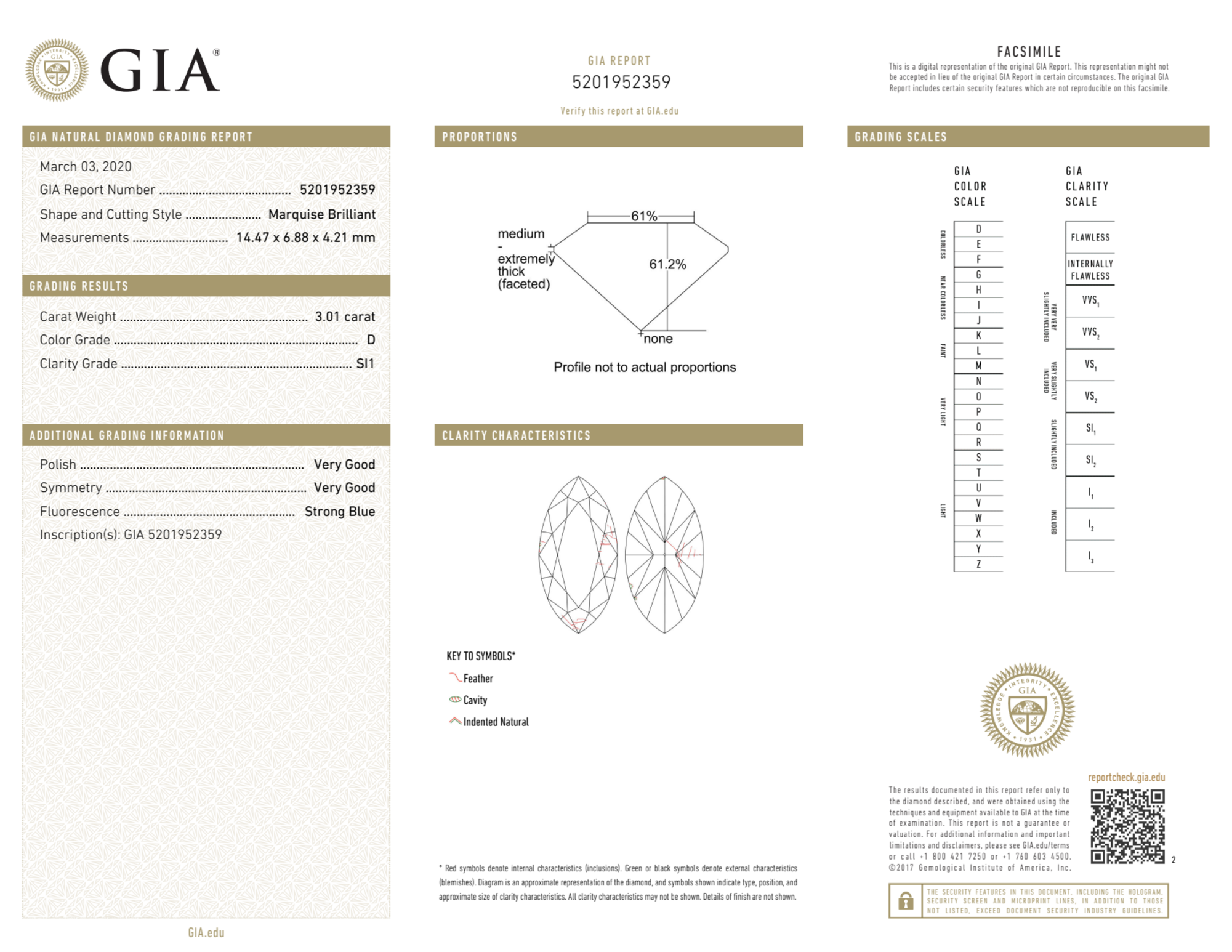 Your 3.01 carat Marquise natural diamond is graded D color (Colorless), and you can read more about D color diamonds here.