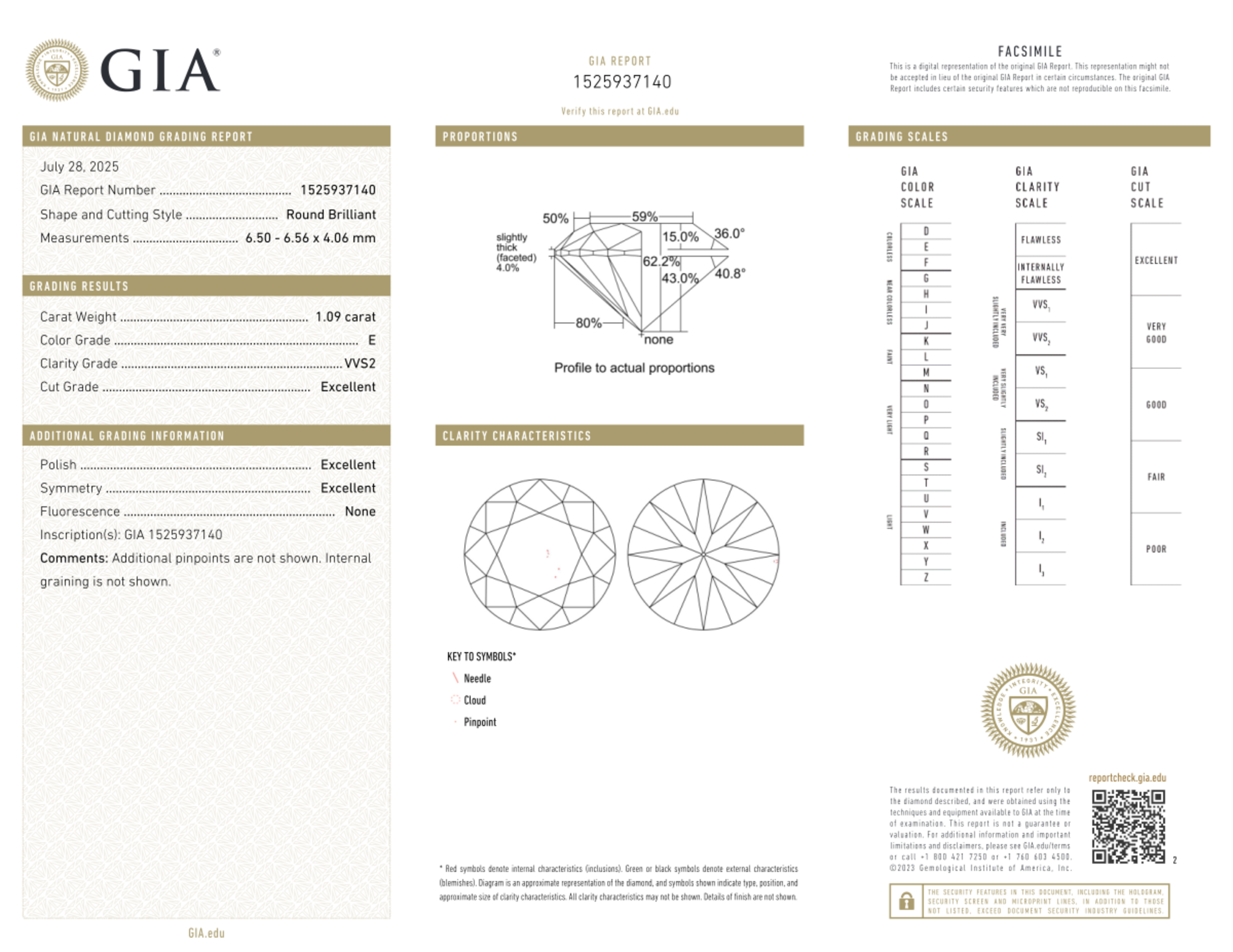 Your 1.09 carat Round natural diamond is graded E color (Colorless), and you can read more about E color diamonds here.