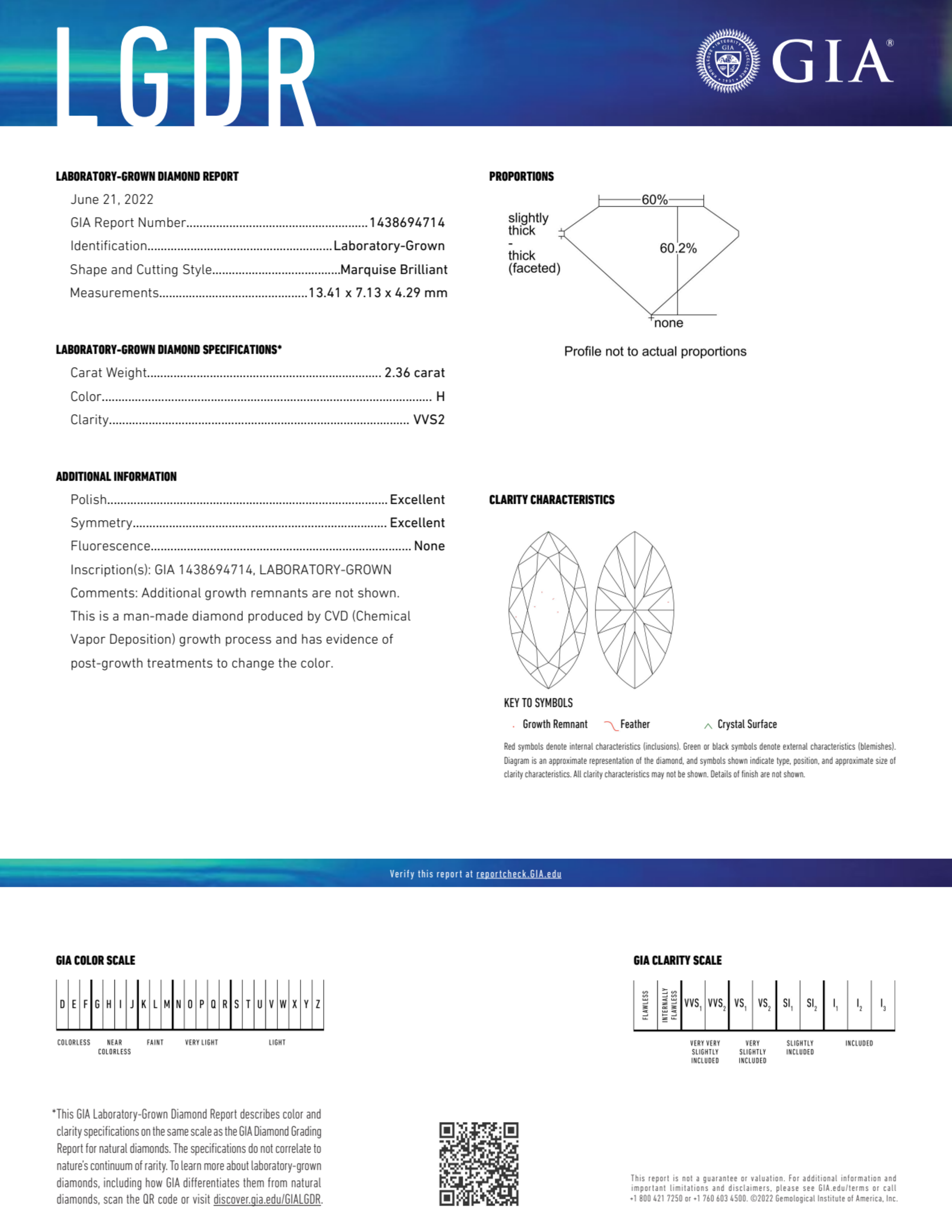 Your 2.36 carat Marquise lab diamond is graded H color (Near Colorless), and you can read more about H color diamonds here.