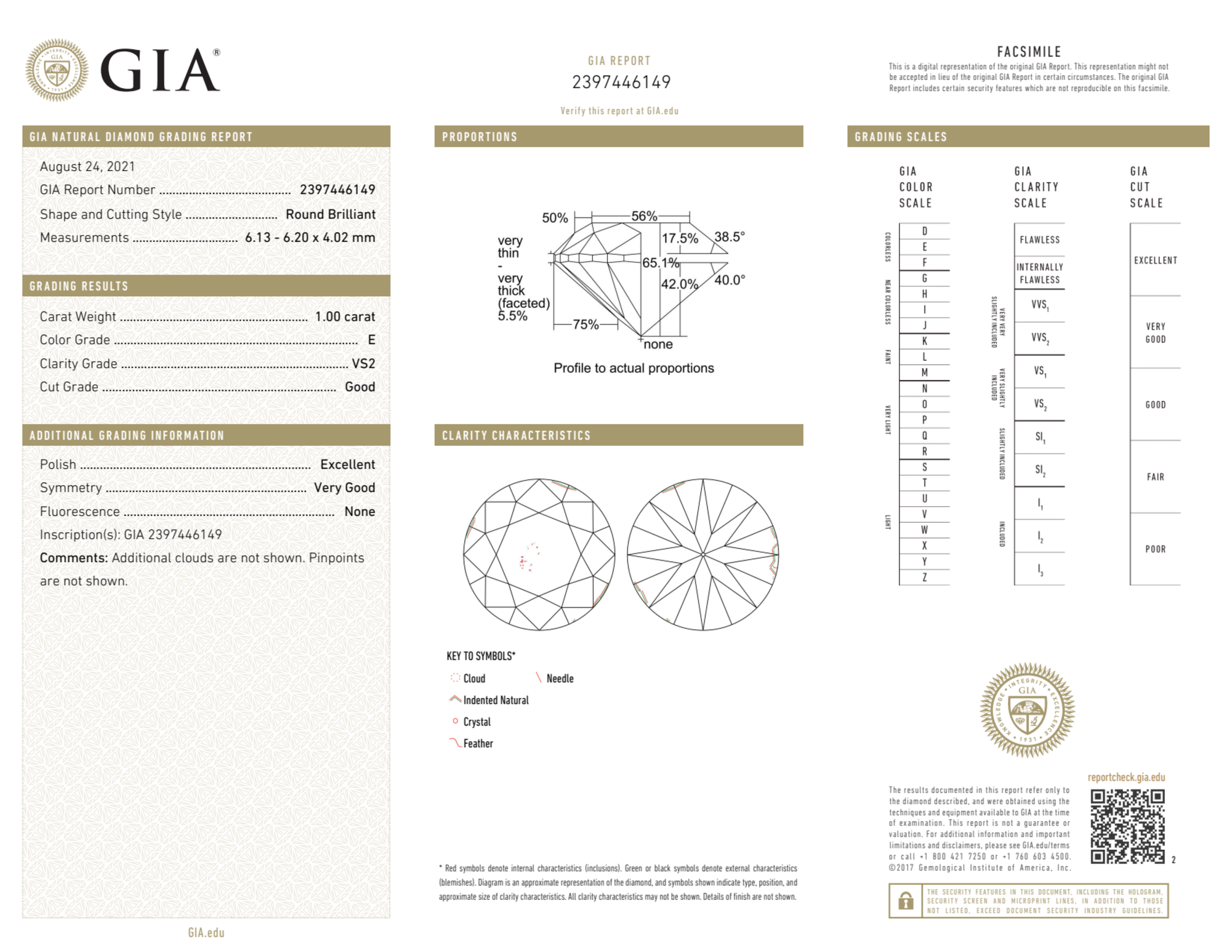 Your 1.00 carat Round natural diamond is graded VS2 clarity, which stands for Very Slightly Included 2. Read more about VS2 clarity diamonds here, or learn more about diamond clarity in general here.