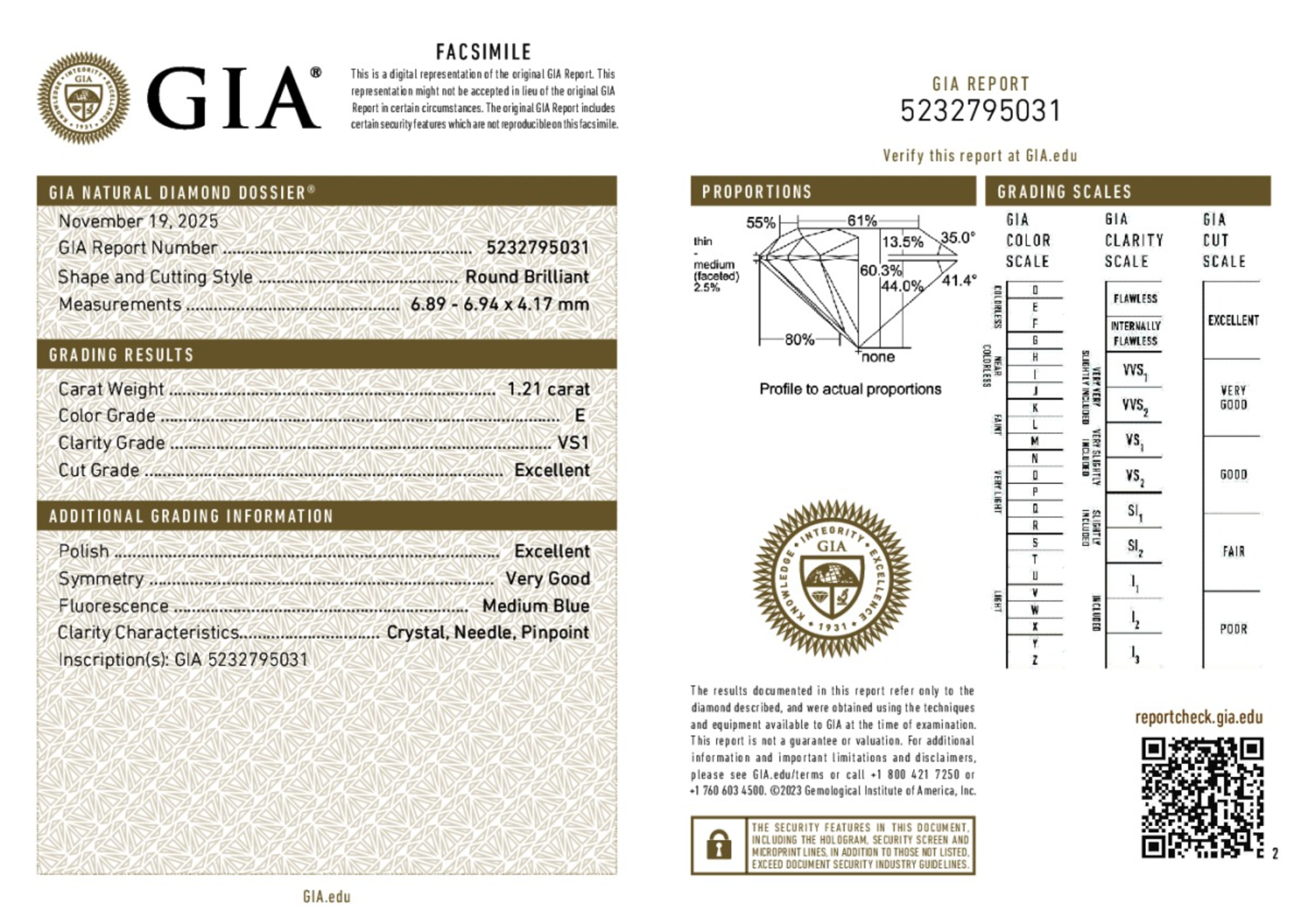Your 1.21 carat Round natural diamond is graded E color (Colorless), and you can read more about E color diamonds here.