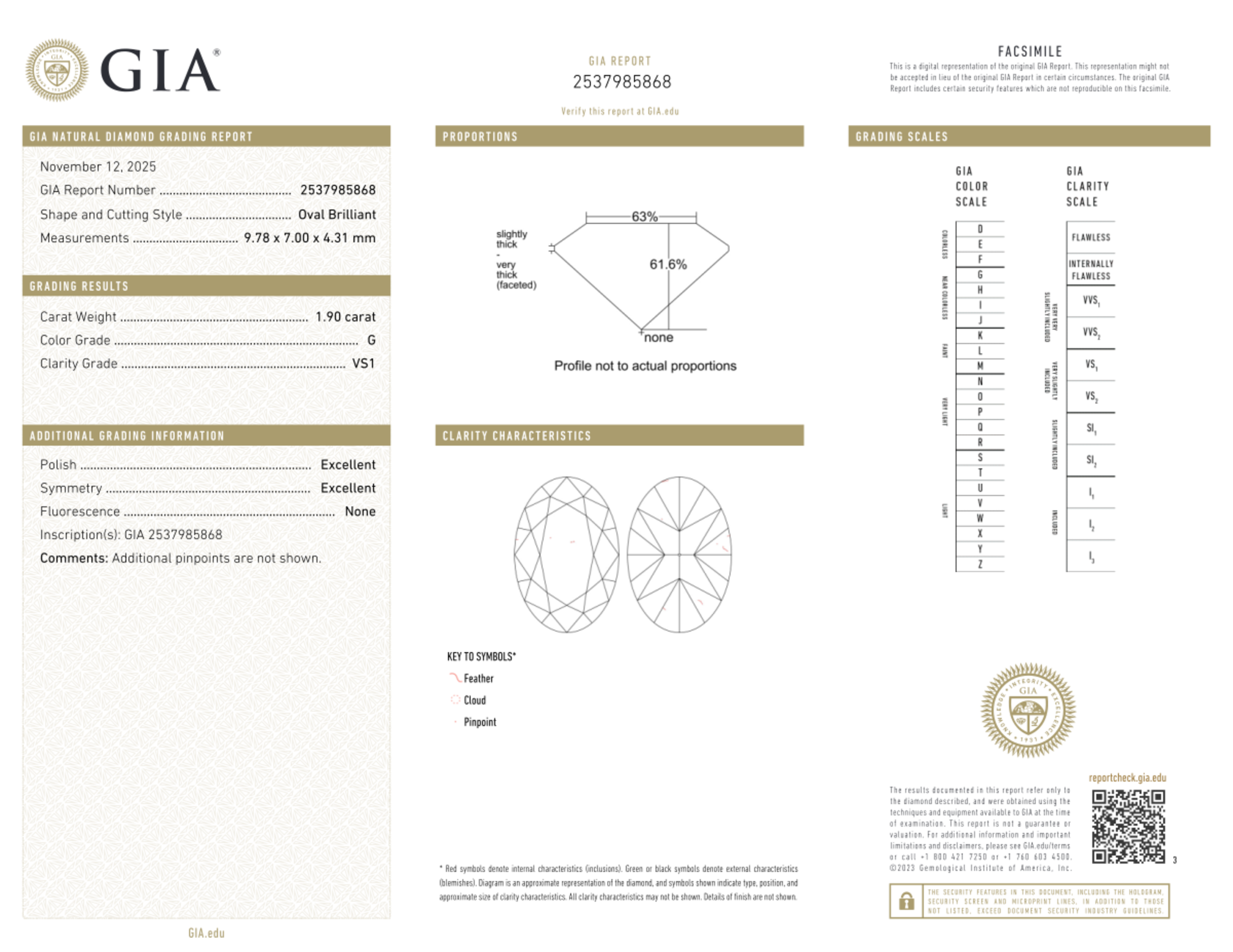 Your 1.90 carat Oval natural diamond is graded G color (Near Colorless), and you can read more about G color diamonds here.