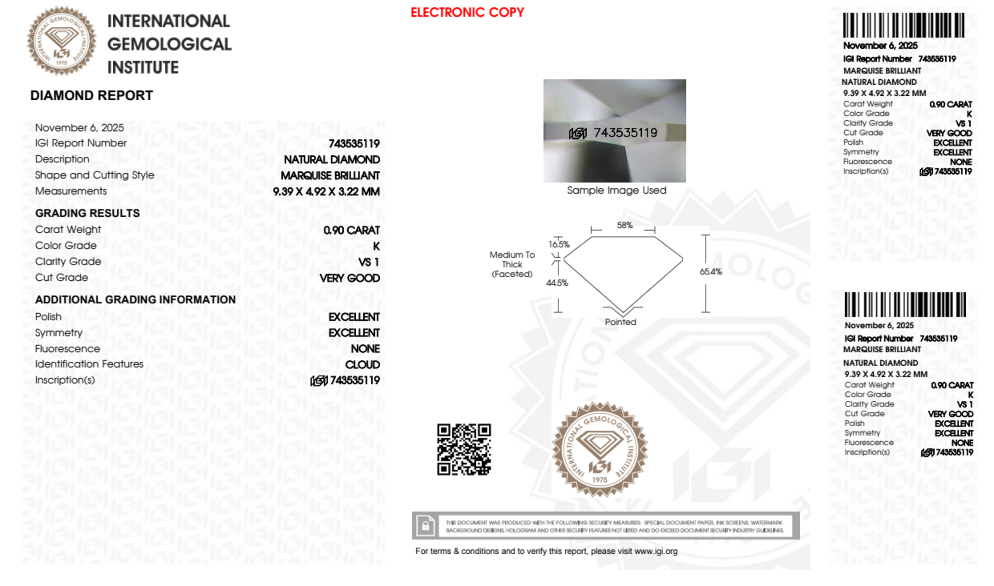 Your 0.90 carat Marquise natural diamond is graded VS1 clarity, which stands for Very Slightly Included 1. Read more about VS1 clarity diamonds here, or learn more about diamond clarity in general here.