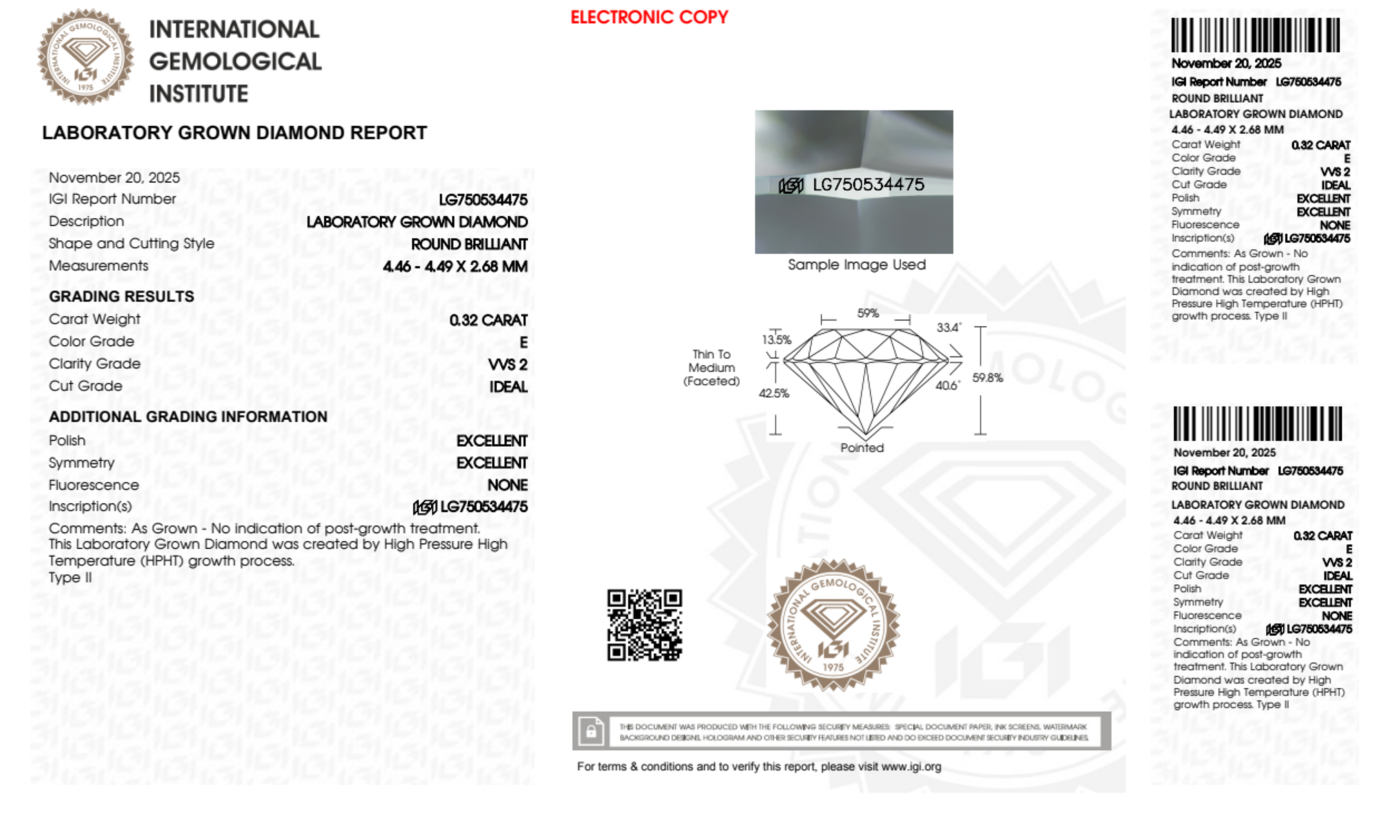 Your 0.32 carat Round lab diamond is graded E color (Colorless), and you can read more about E color diamonds here.