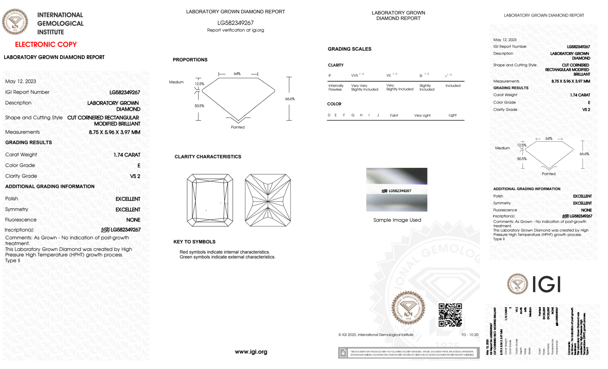 Your 1.74 carat Radiant lab diamond is graded E color (Colorless), and you can read more about E color diamonds here.