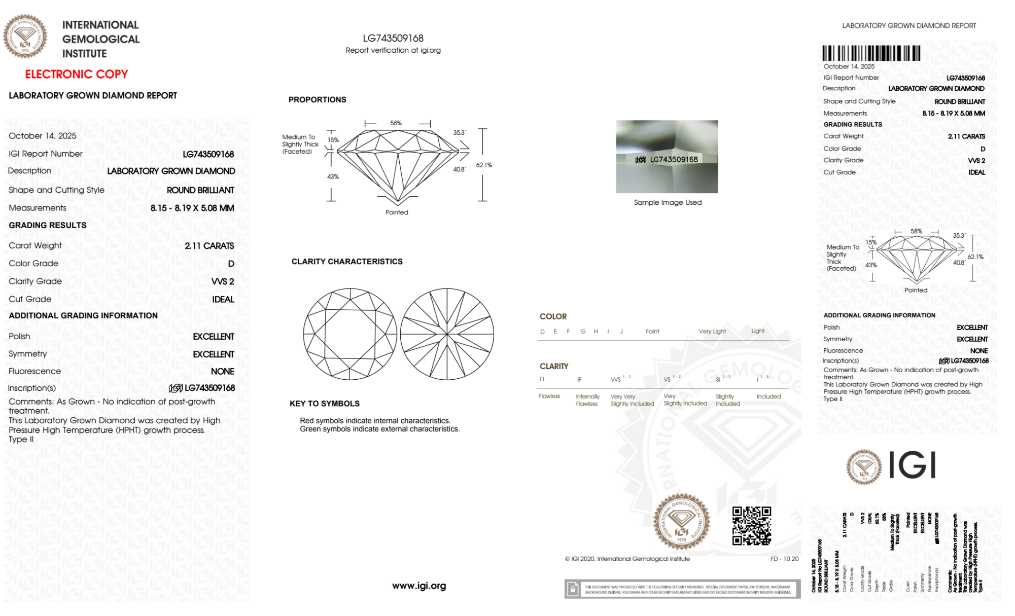 Your 2.11 carat Round lab diamond is graded D color (Colorless), and you can read more about D color diamonds here.