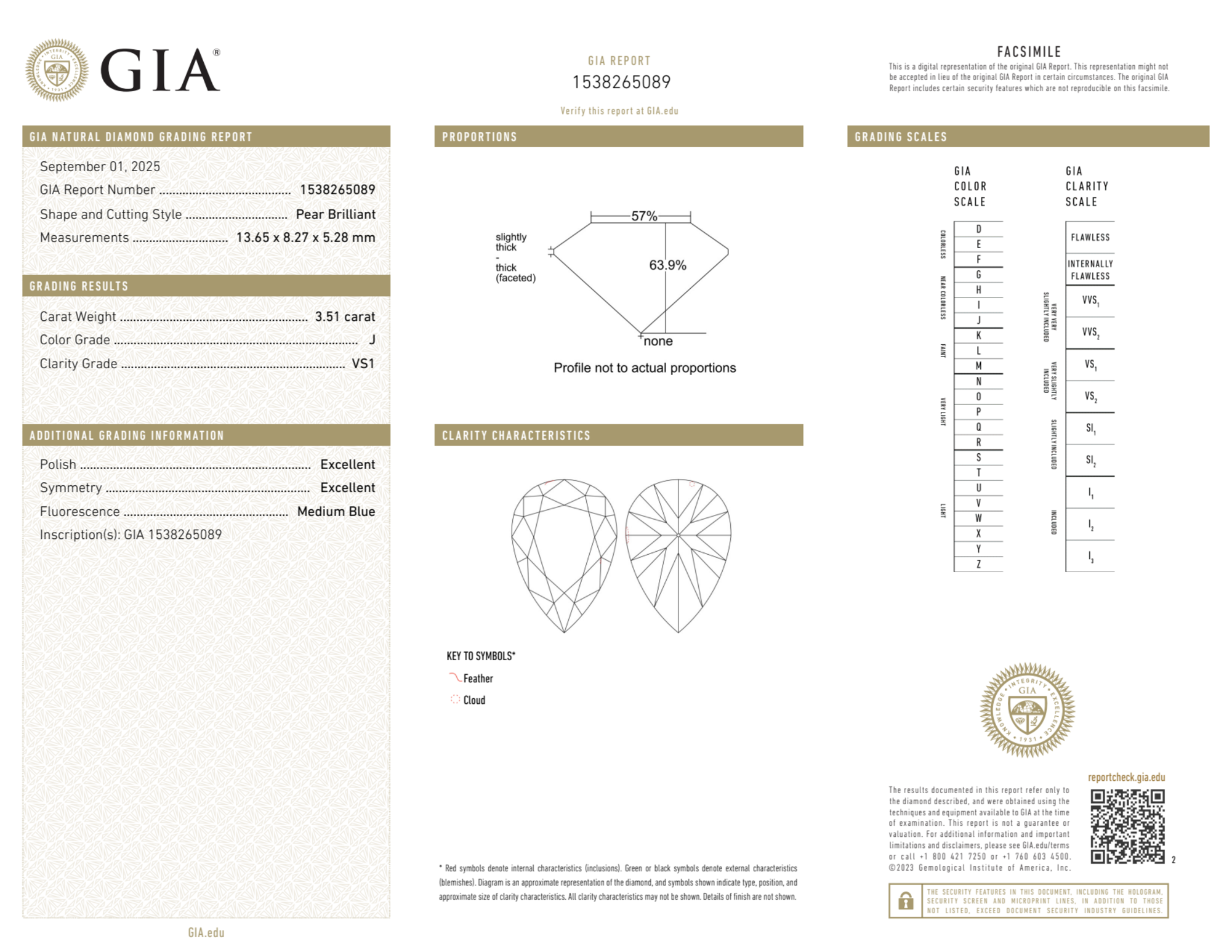 Your 3.51 carat Pear natural diamond is graded VS1 clarity, which stands for Very Slightly Included 1. Read more about VS1 clarity diamonds here, or learn more about diamond clarity in general here.