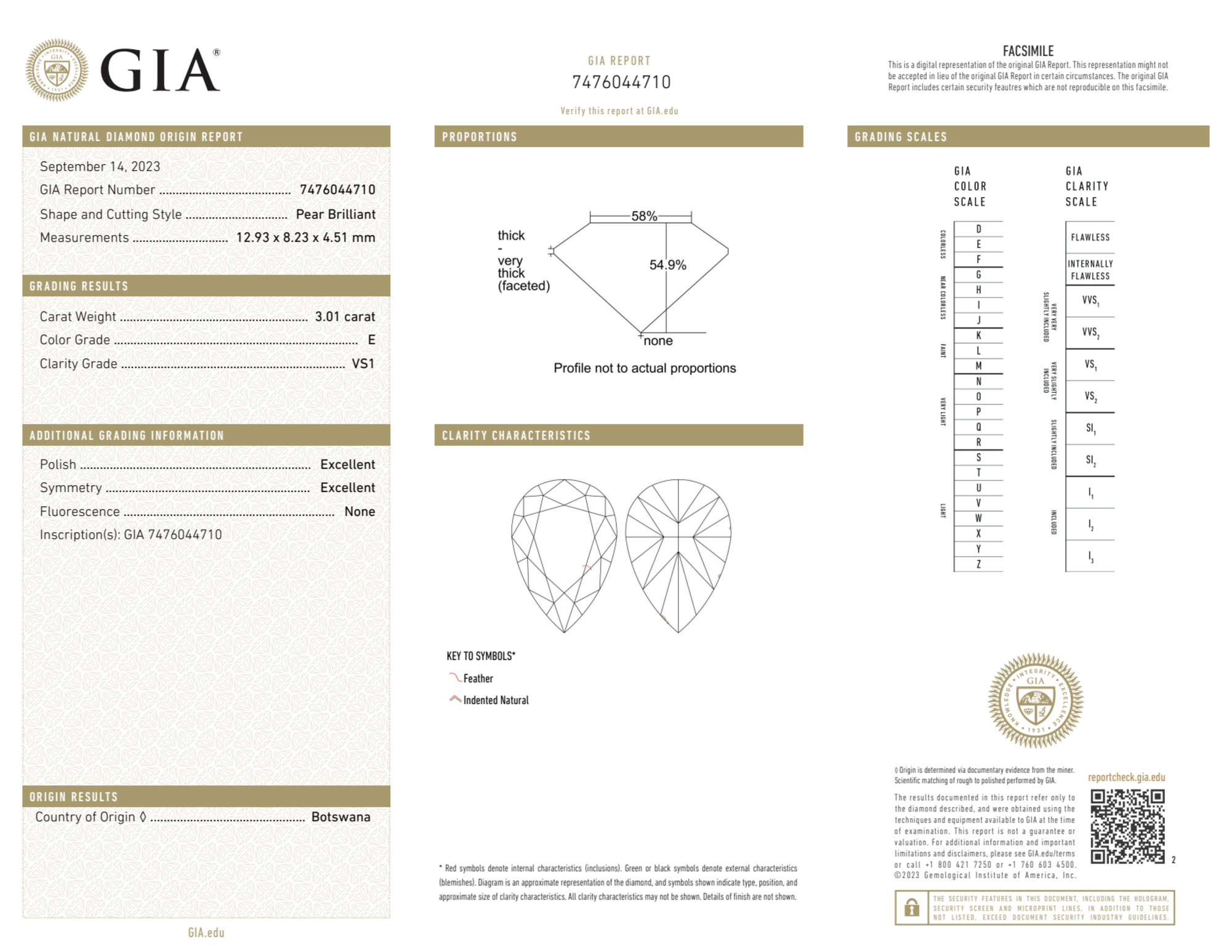 Your 3.01 carat Pear natural diamond is graded E color (Colorless), and you can read more about E color diamonds here.