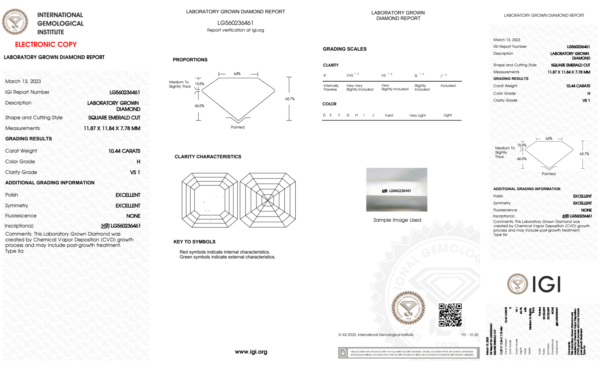 Your 10.44 carat Asscher lab diamond is graded H color (Near Colorless), and you can read more about H color diamonds here.