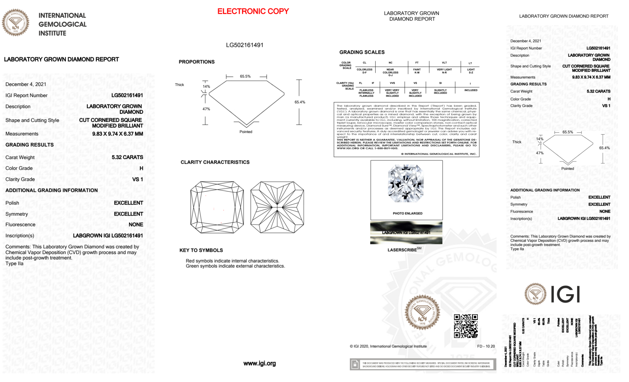 Your 5.32 carat Radiant lab diamond is graded H color (Near Colorless), and you can read more about H color diamonds here.