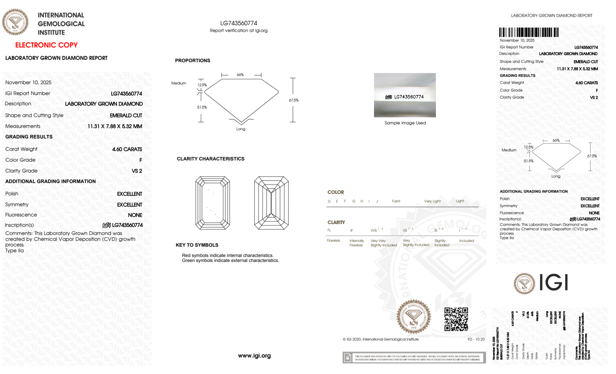 Your 4.60 carat Emerald lab diamond is graded F color (Colorless), and you can read more about F color diamonds here.