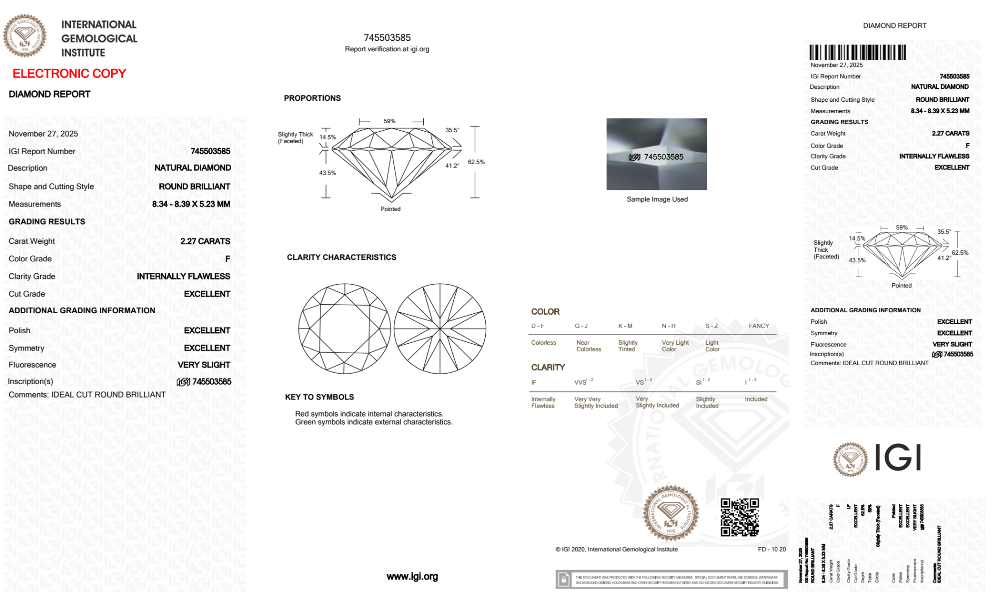 Your 2.27 carat Round natural diamond is graded IF clarity, which stands for Internally Flawless. Read more about IF clarity diamonds here, or learn more about diamond clarity in general here.