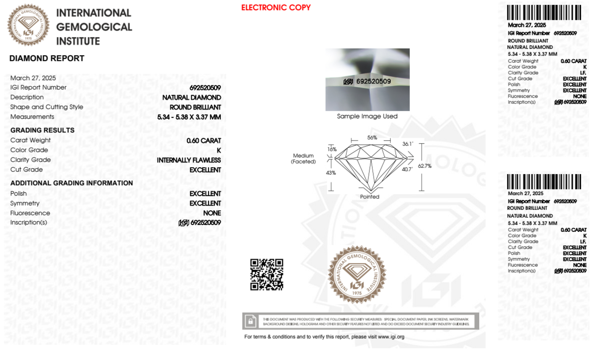 Your 0.60 carat Round natural diamond is graded IF clarity, which stands for Internally Flawless. Read more about IF clarity diamonds here, or learn more about diamond clarity in general here.