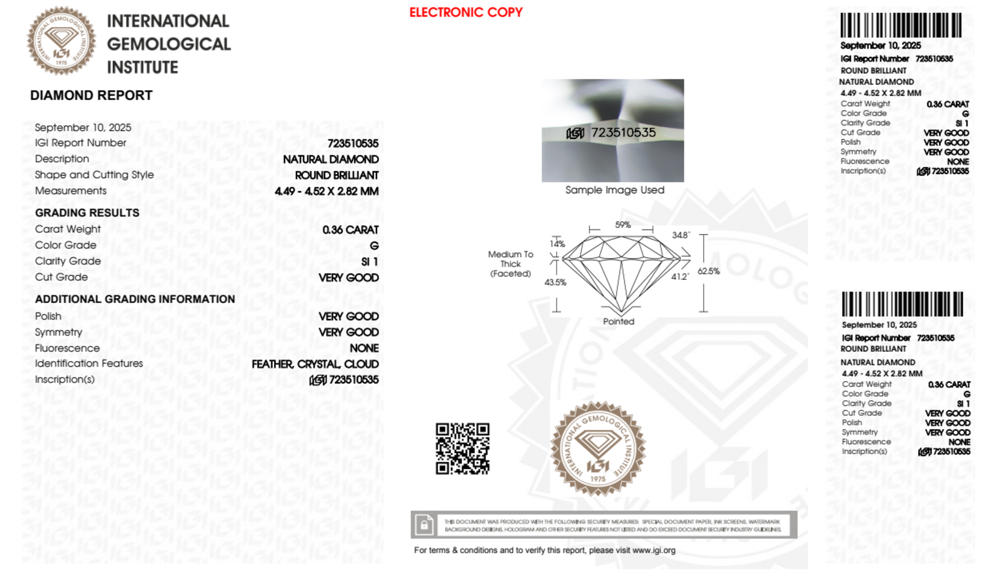 Your 0.36 carat Round natural diamond is graded G color (Near Colorless), and you can read more about G color diamonds here.