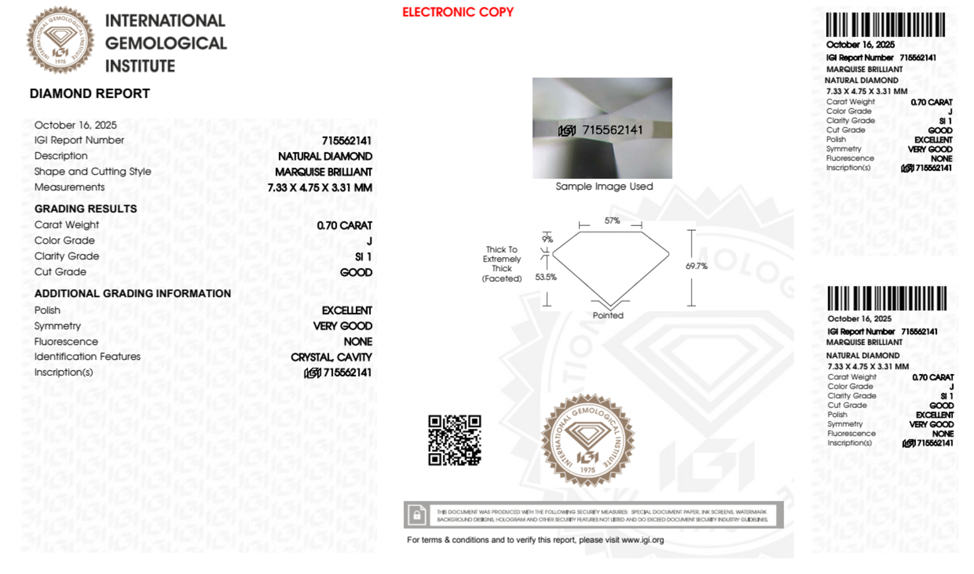 Your 0.70 carat Marquise natural diamond is graded J color (Near Colorless), and you can read more about J color diamonds here.
