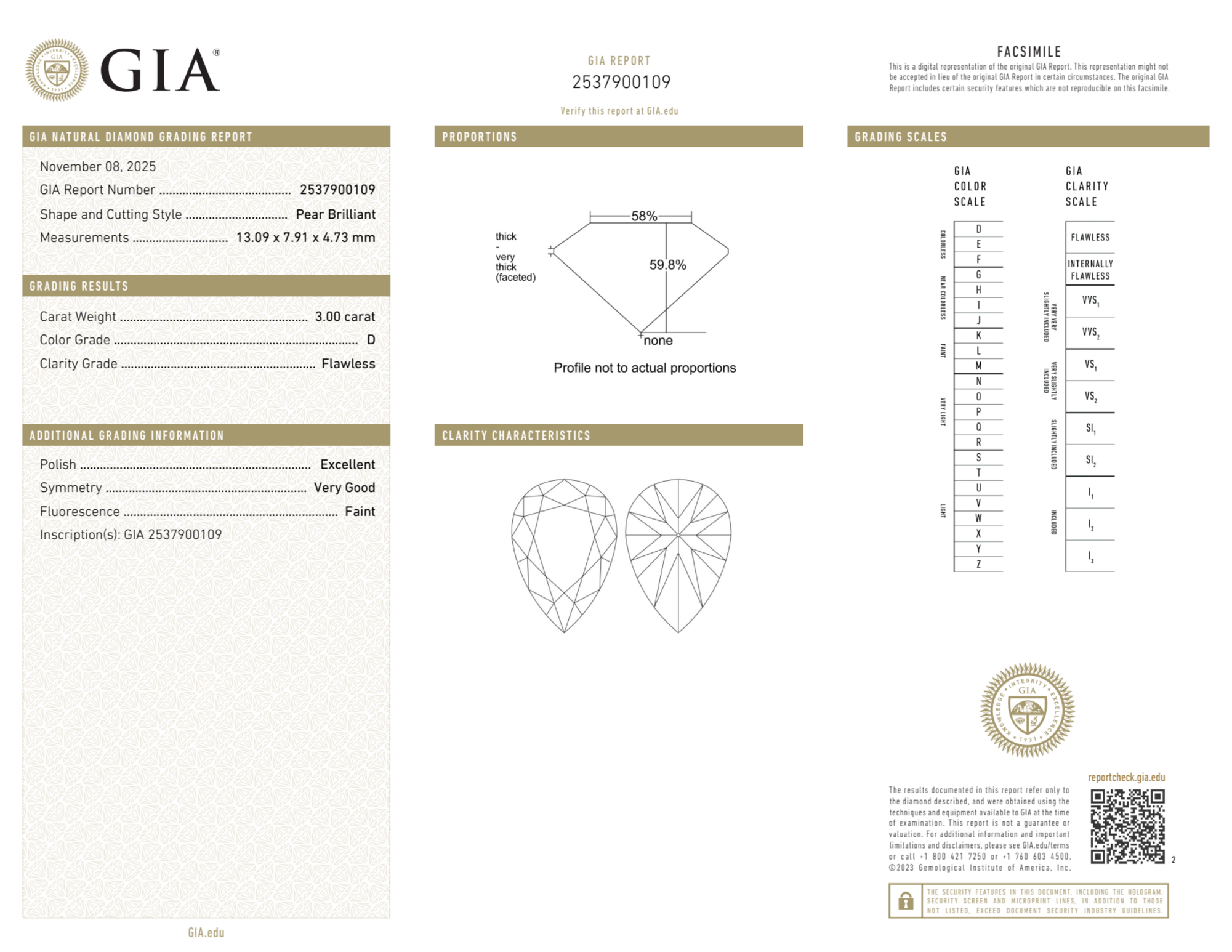 Your 3.00 carat Pear natural diamond is graded D color (Colorless), and you can read more about D color diamonds here.