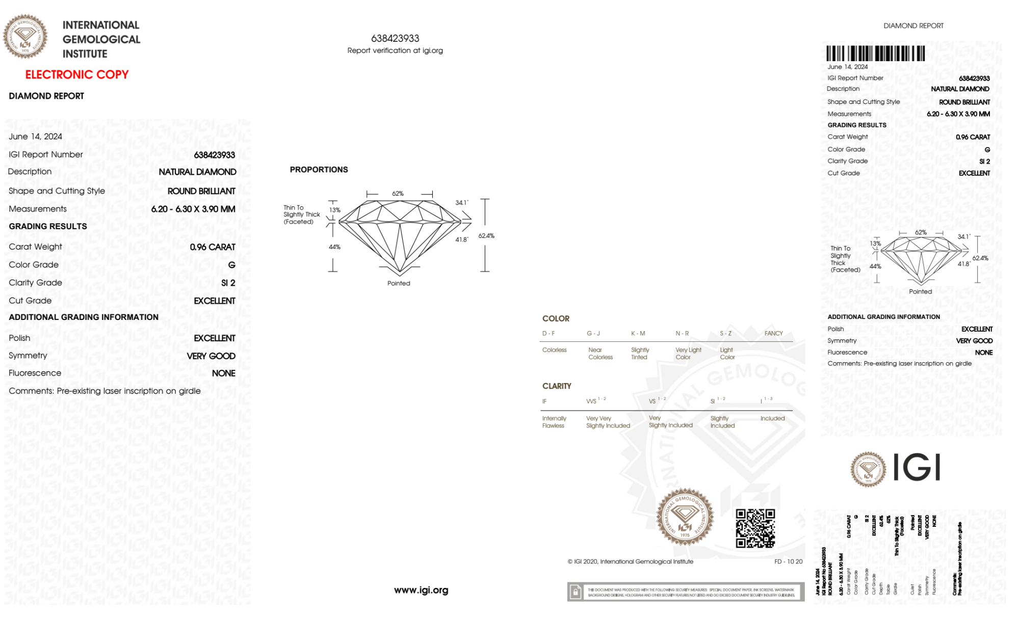 Your 0.96 carat Round natural diamond is graded G color (Near Colorless), and you can read more about G color diamonds here.