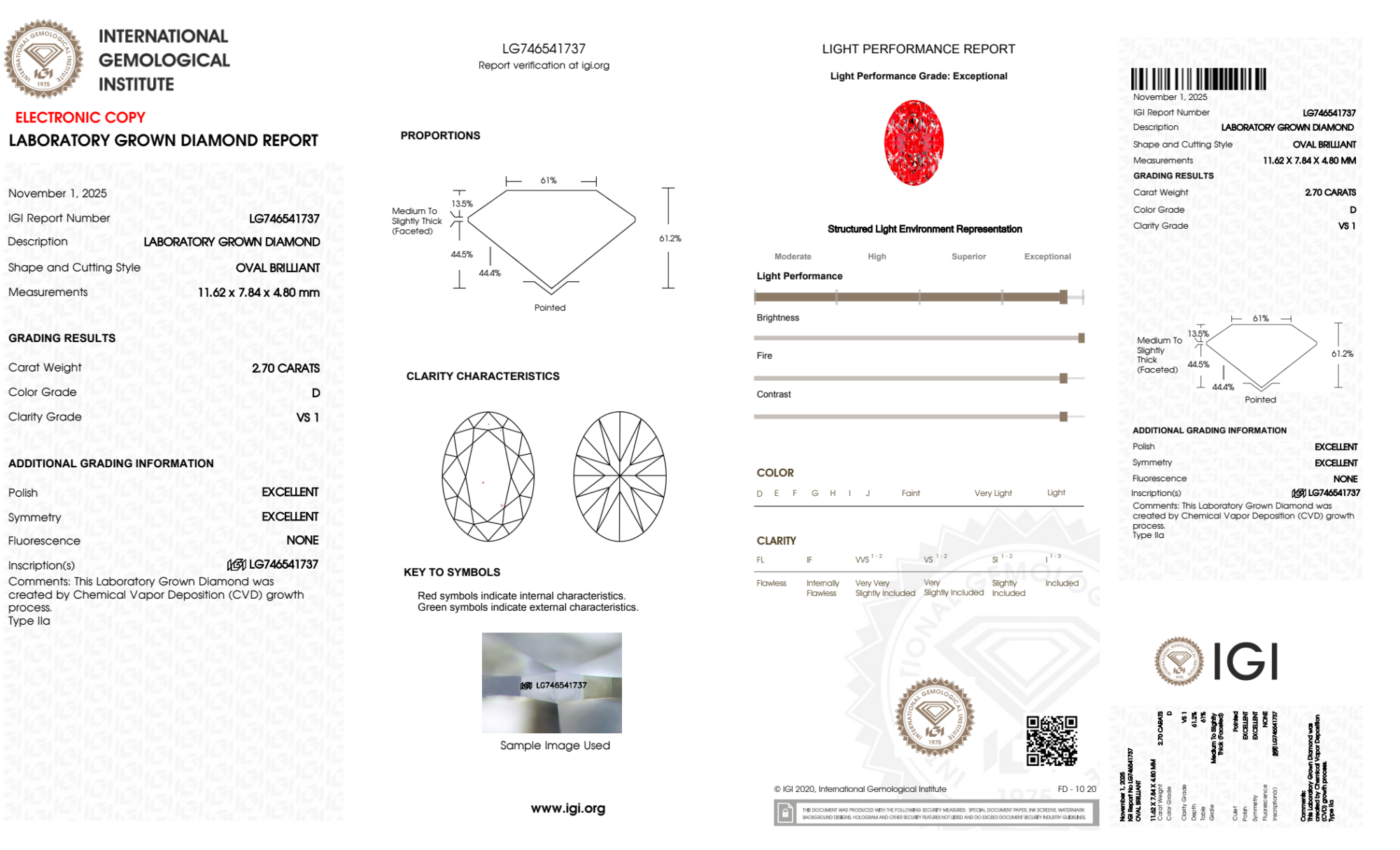 Your 2.70 carat Oval lab diamond is graded VS1 clarity, which stands for Very Slightly Included 1. Read more about VS1 clarity diamonds here, or learn more about diamond clarity in general here.