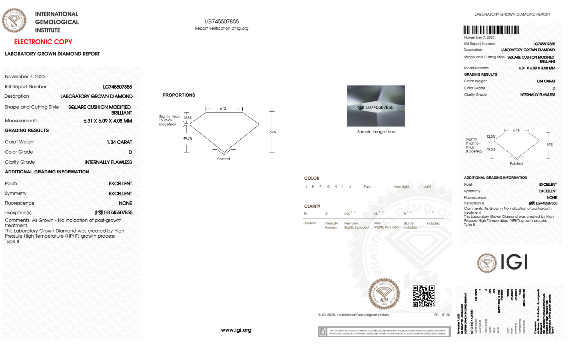 Your 1.34 carat Cushion lab diamond is graded IF clarity, which stands for Internally Flawless. Read more about IF clarity diamonds here, or learn more about diamond clarity in general here.