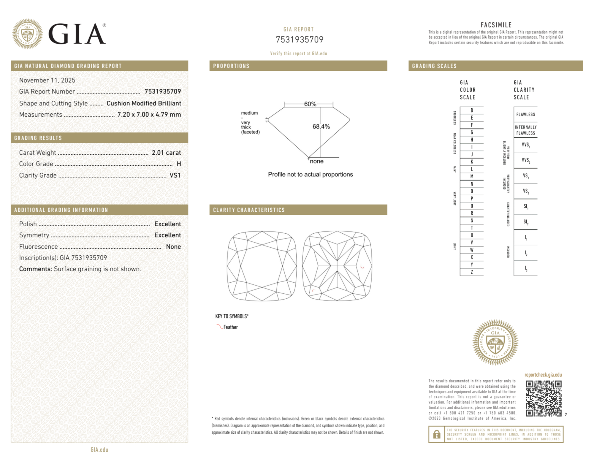 Your 2.01 carat Cushion natural diamond is graded VS1 clarity, which stands for Very Slightly Included 1. Read more about VS1 clarity diamonds here, or learn more about diamond clarity in general here.