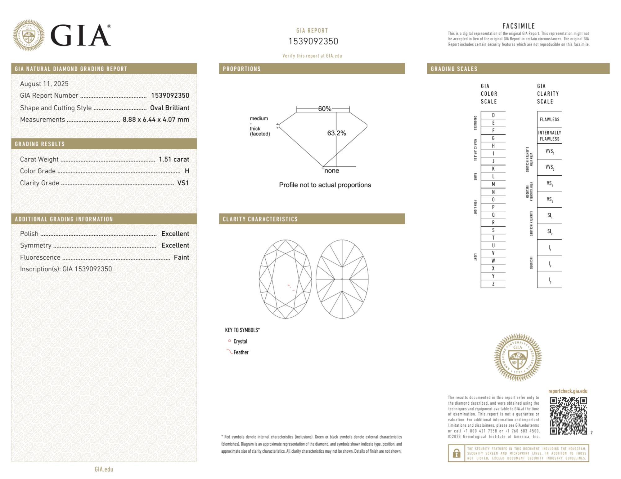 Your 1.51 carat Oval natural diamond is graded VS1 clarity, which stands for Very Slightly Included 1. Read more about VS1 clarity diamonds here, or learn more about diamond clarity in general here.