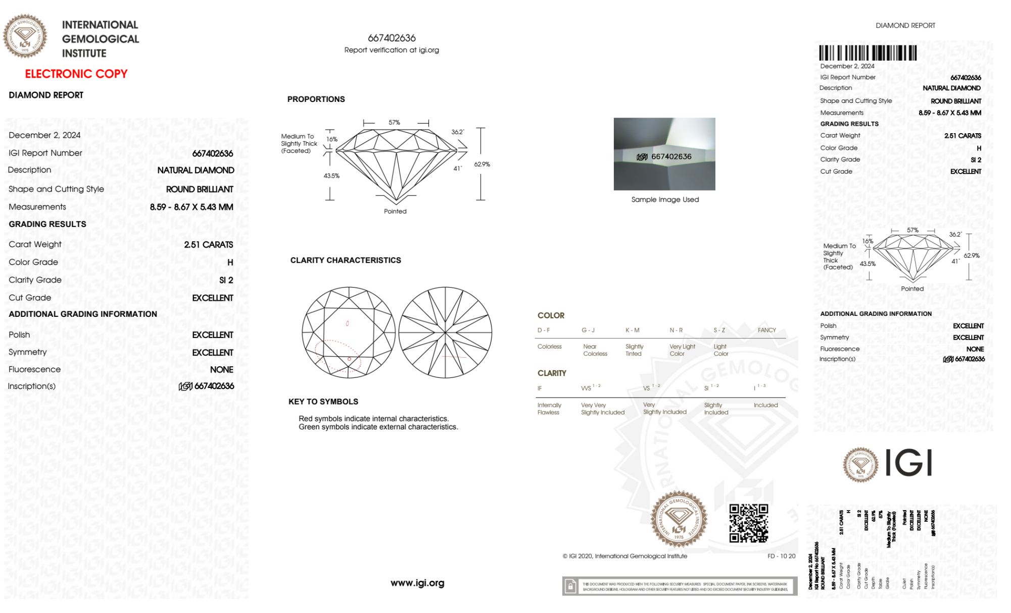 Your 2.51 carat Round natural diamond is graded SI2 clarity, which stands for Slightly Included 2. Read more about SI2 clarity diamonds here, or learn more about diamond clarity in general here.