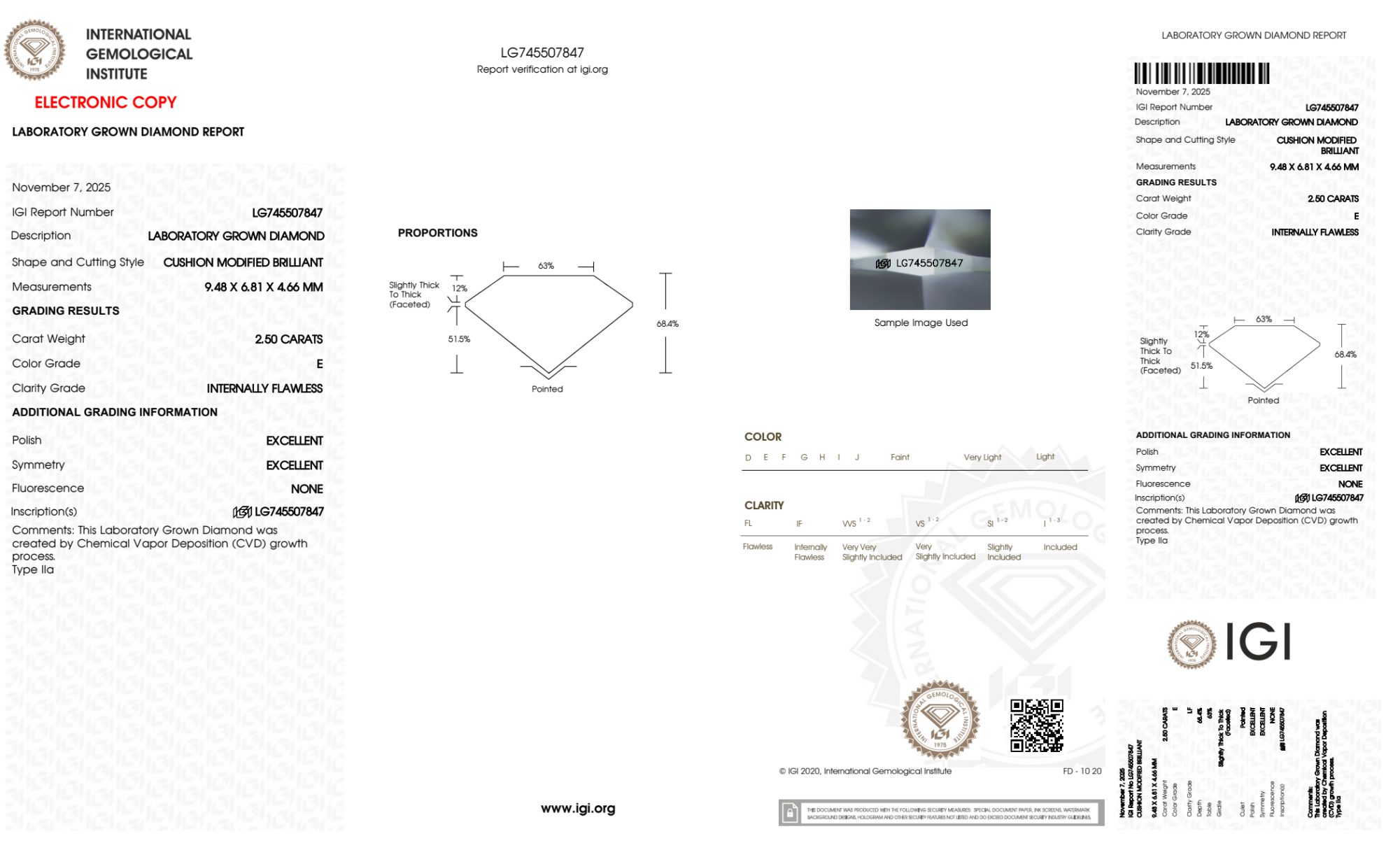 Your 2.50 carat Cushion lab diamond is graded E color (Colorless), and you can read more about E color diamonds here.