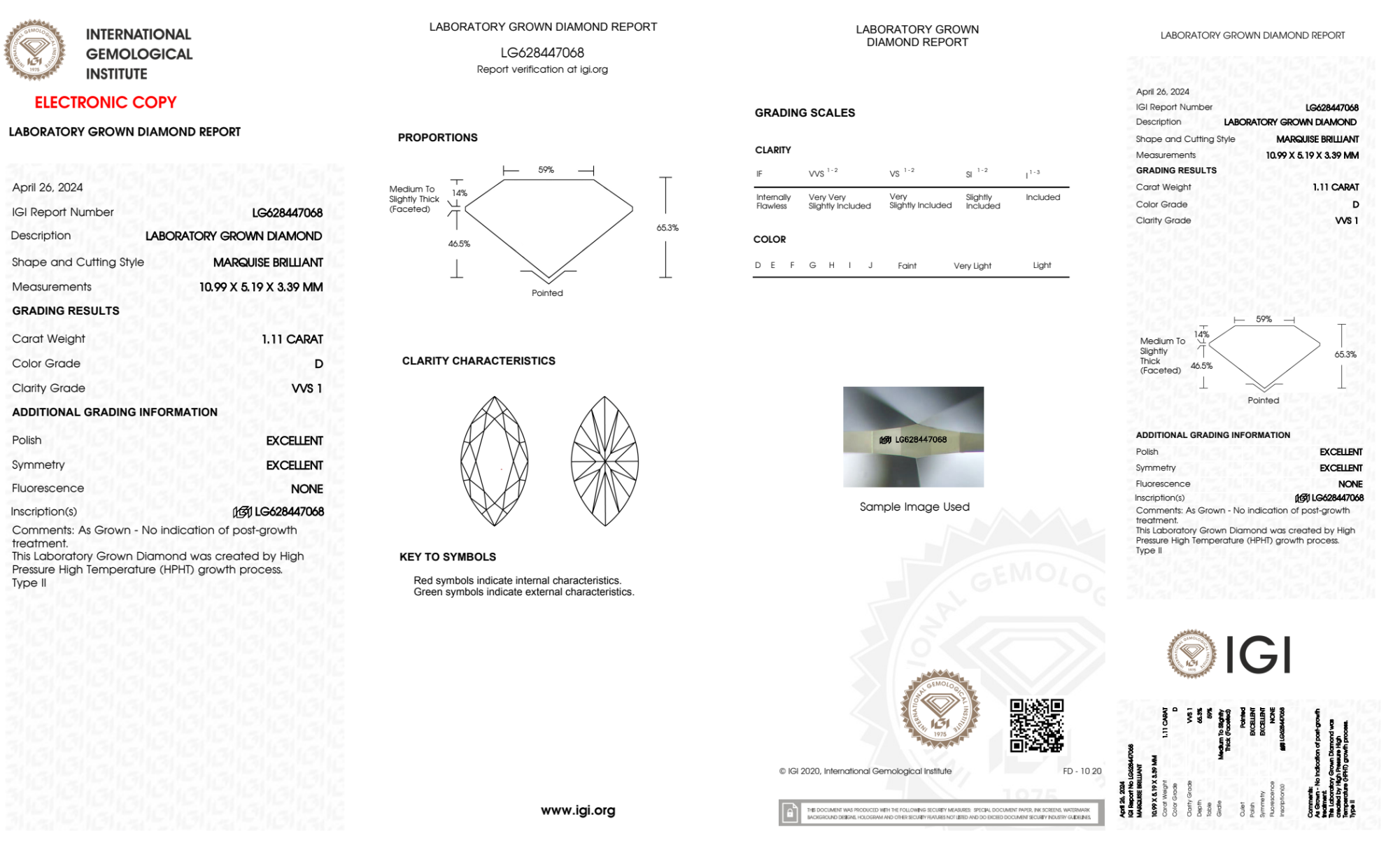Your 1.11 carat Marquise lab diamond is graded D color (Colorless), and you can read more about D color diamonds here.