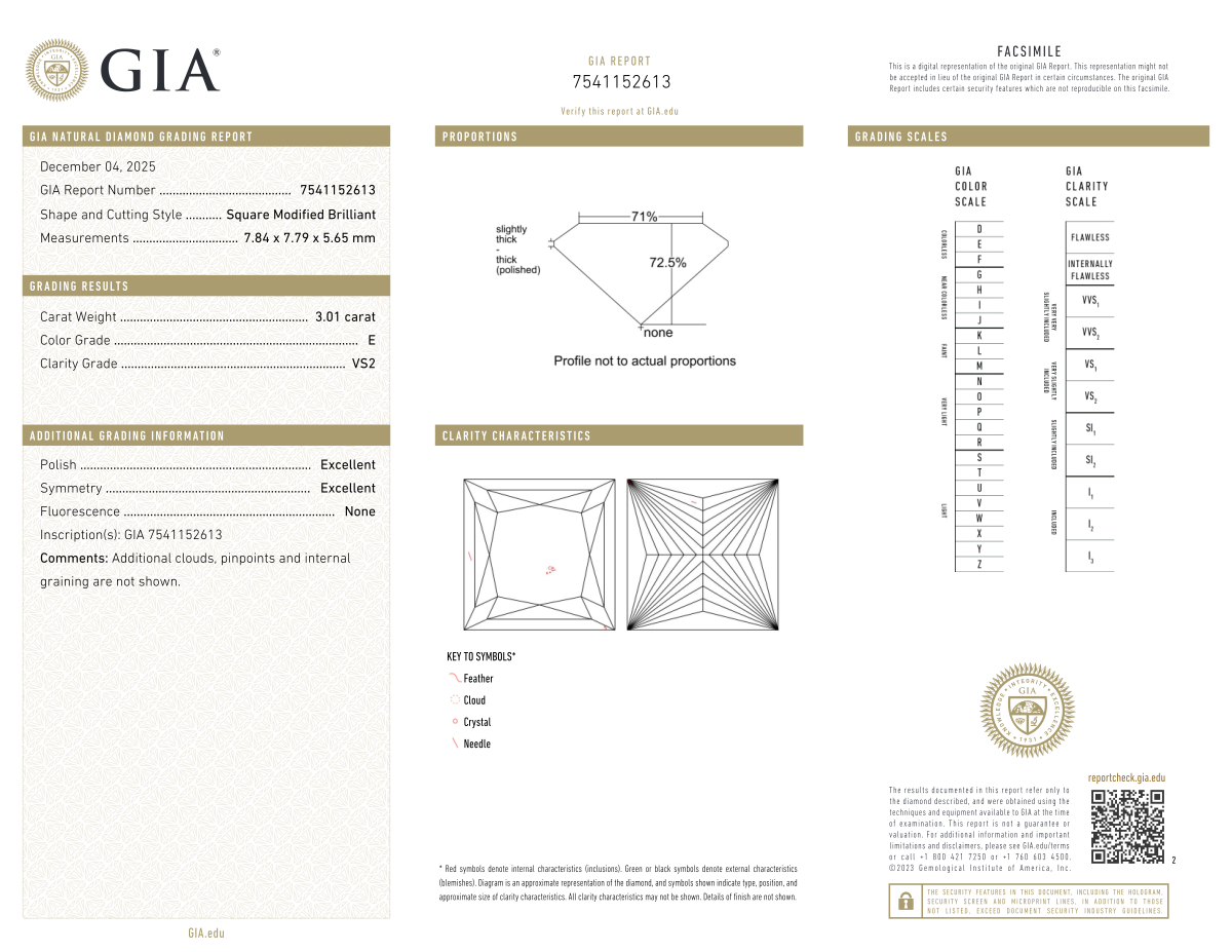 Your 3.01 carat Princess natural diamond is graded E color (Colorless), and you can read more about E color diamonds here.