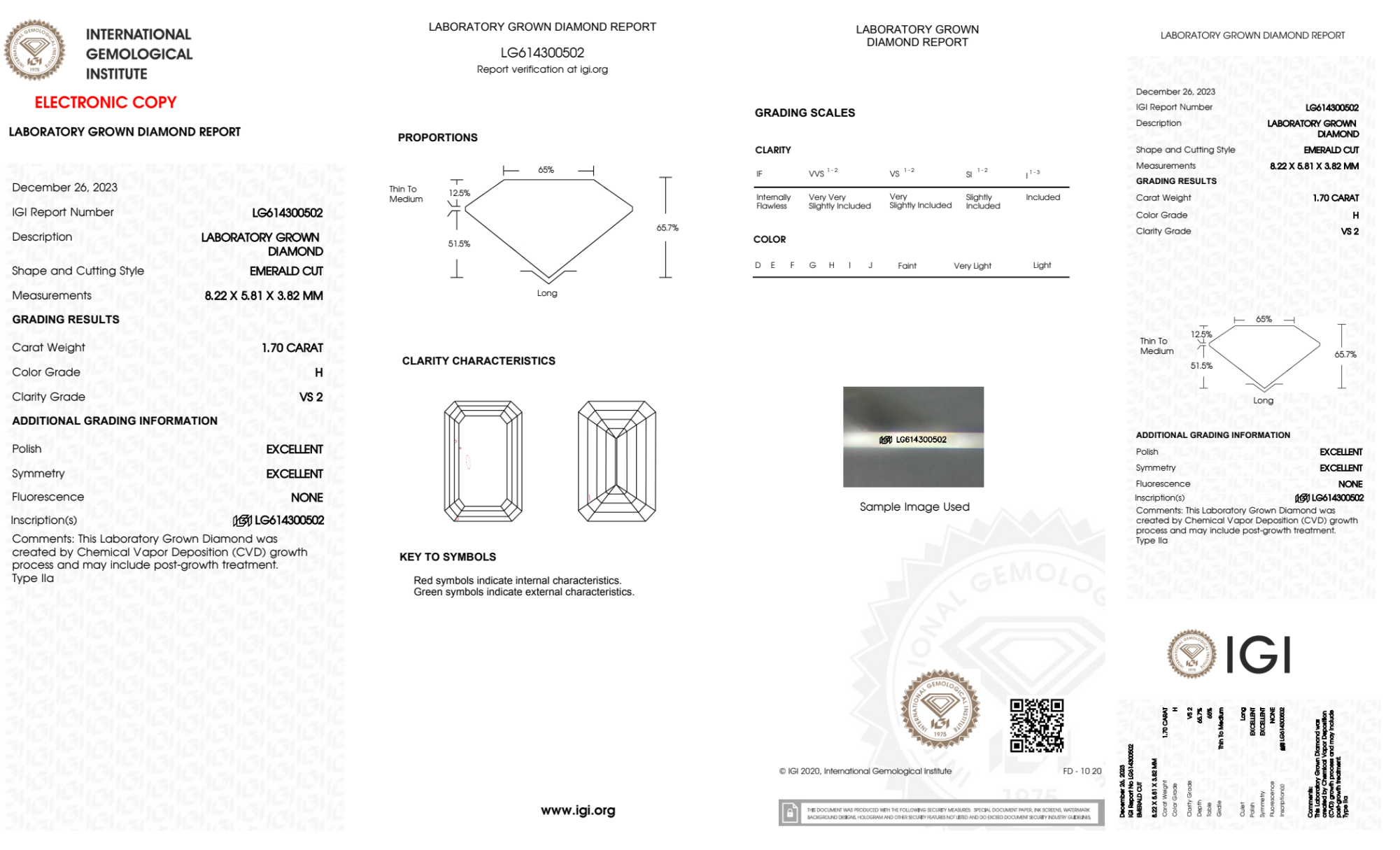 Your 1.70 carat Emerald lab diamond is graded H color (Near Colorless), and you can read more about H color diamonds here.