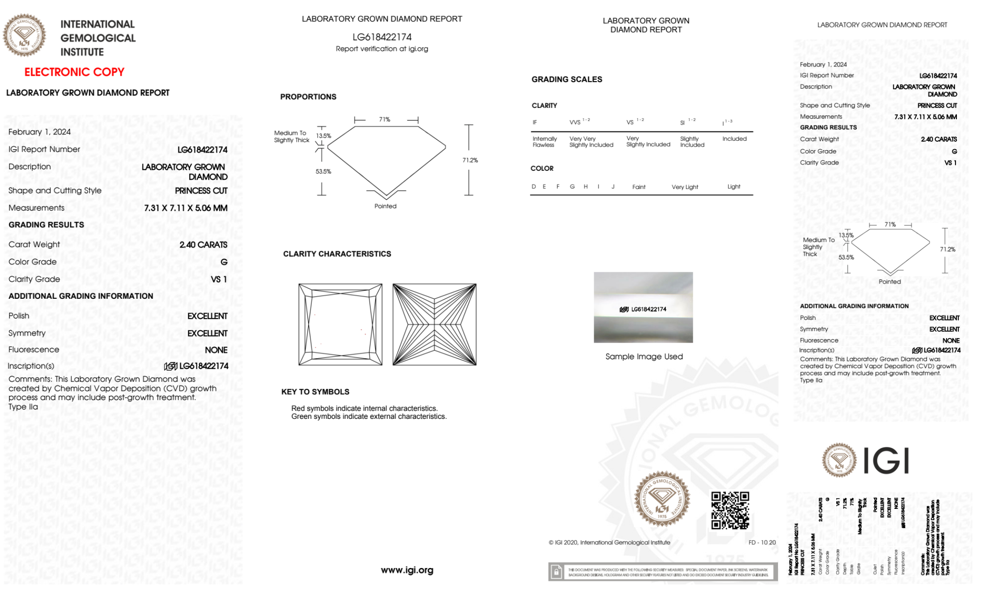 Your 2.40 carat Princess lab diamond is graded G color (Near Colorless), and you can read more about G color diamonds here.