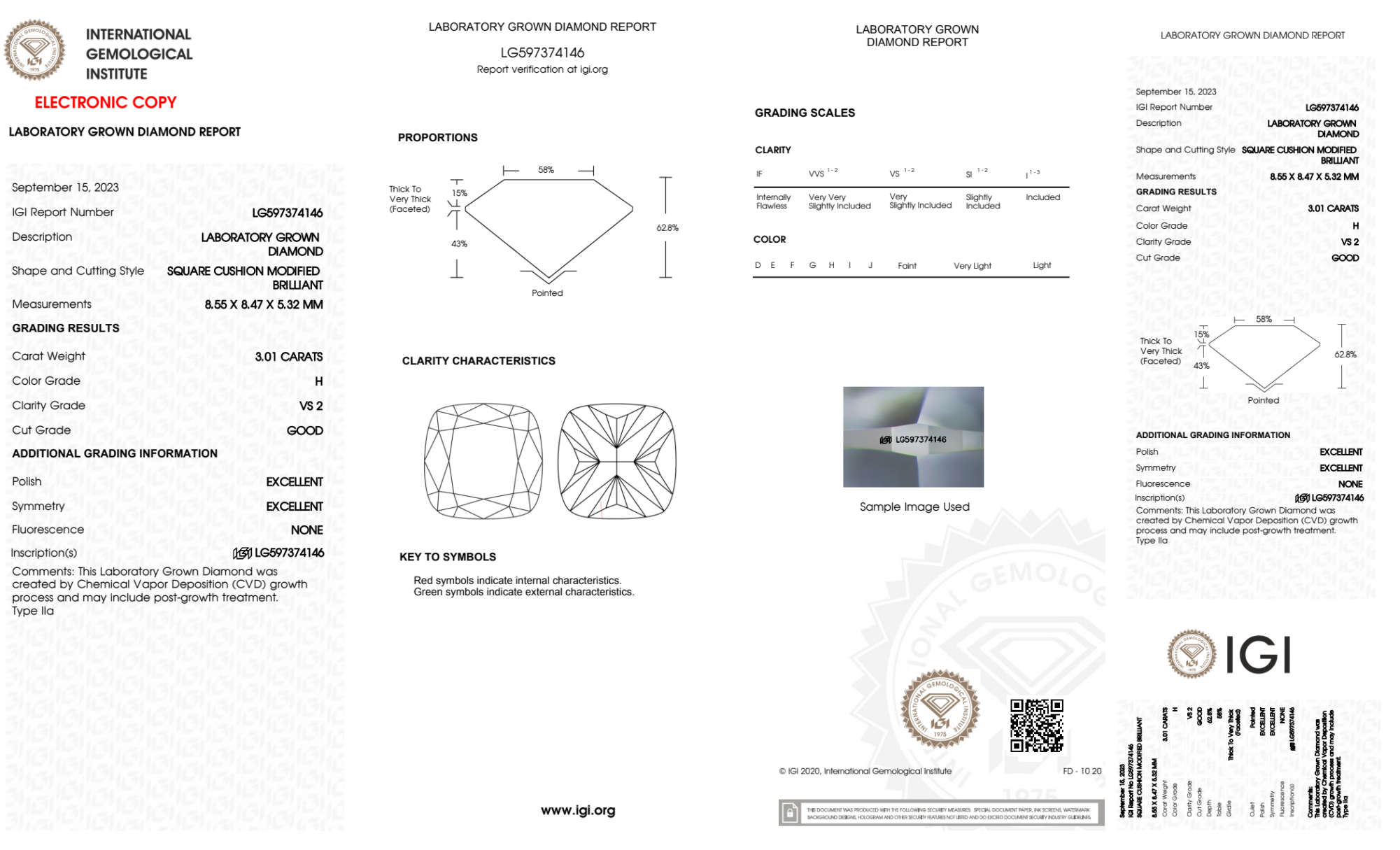 Your 3.01 carat Cushion lab diamond is graded H color (Near Colorless), and you can read more about H color diamonds here.