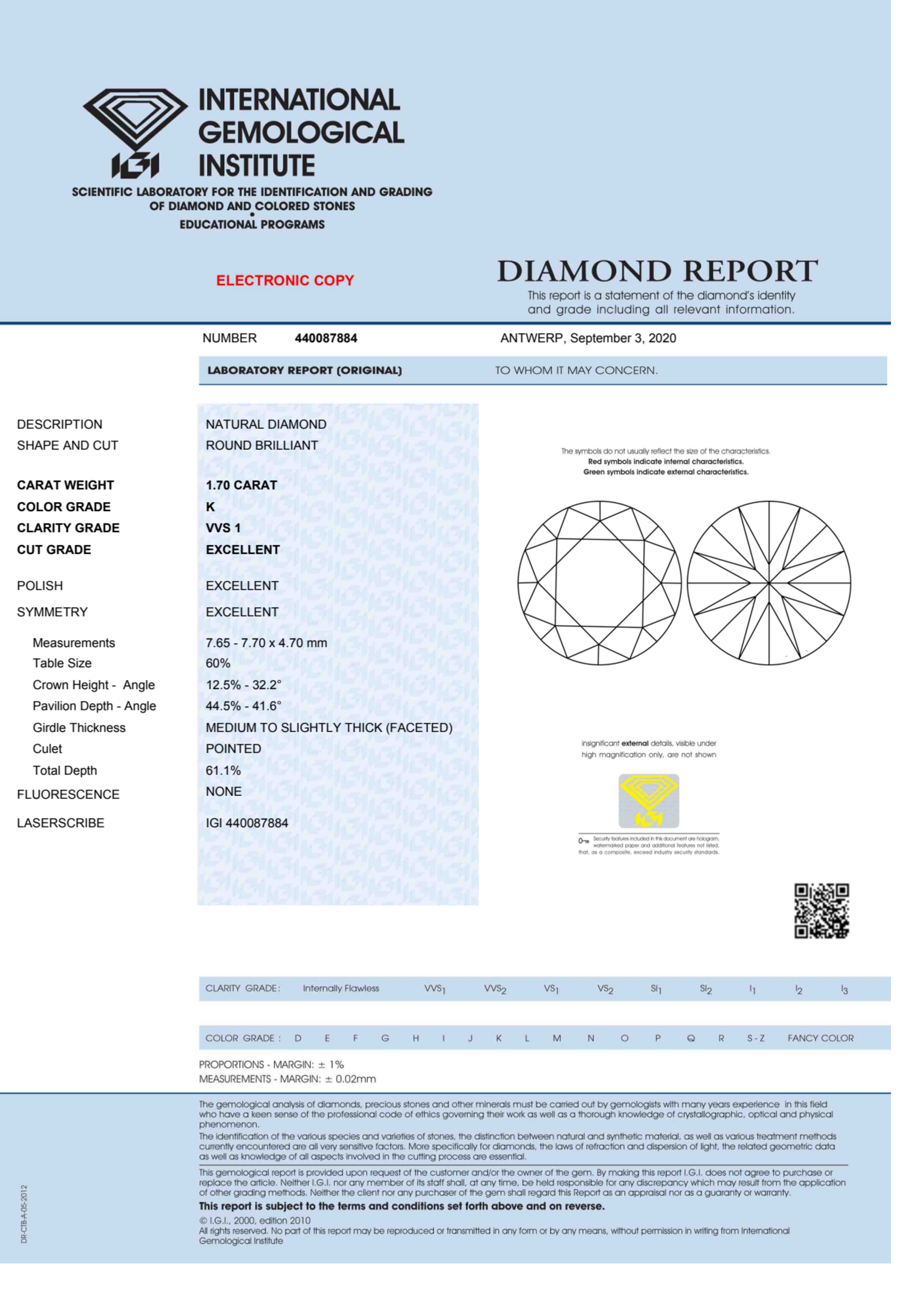 Your 1.70 carat Round natural diamond is graded VVS1 clarity, which stands for Very Very Slightly Included 1. Read more about VVS1 clarity diamonds here, or learn more about diamond clarity in general here.