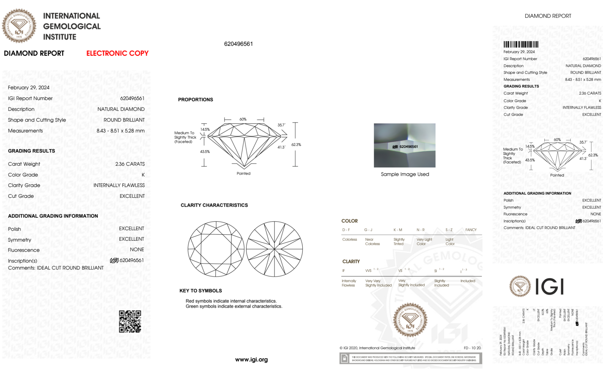 Your 2.36 carat Round natural diamond is graded IF clarity, which stands for Internally Flawless. Read more about IF clarity diamonds here, or learn more about diamond clarity in general here.