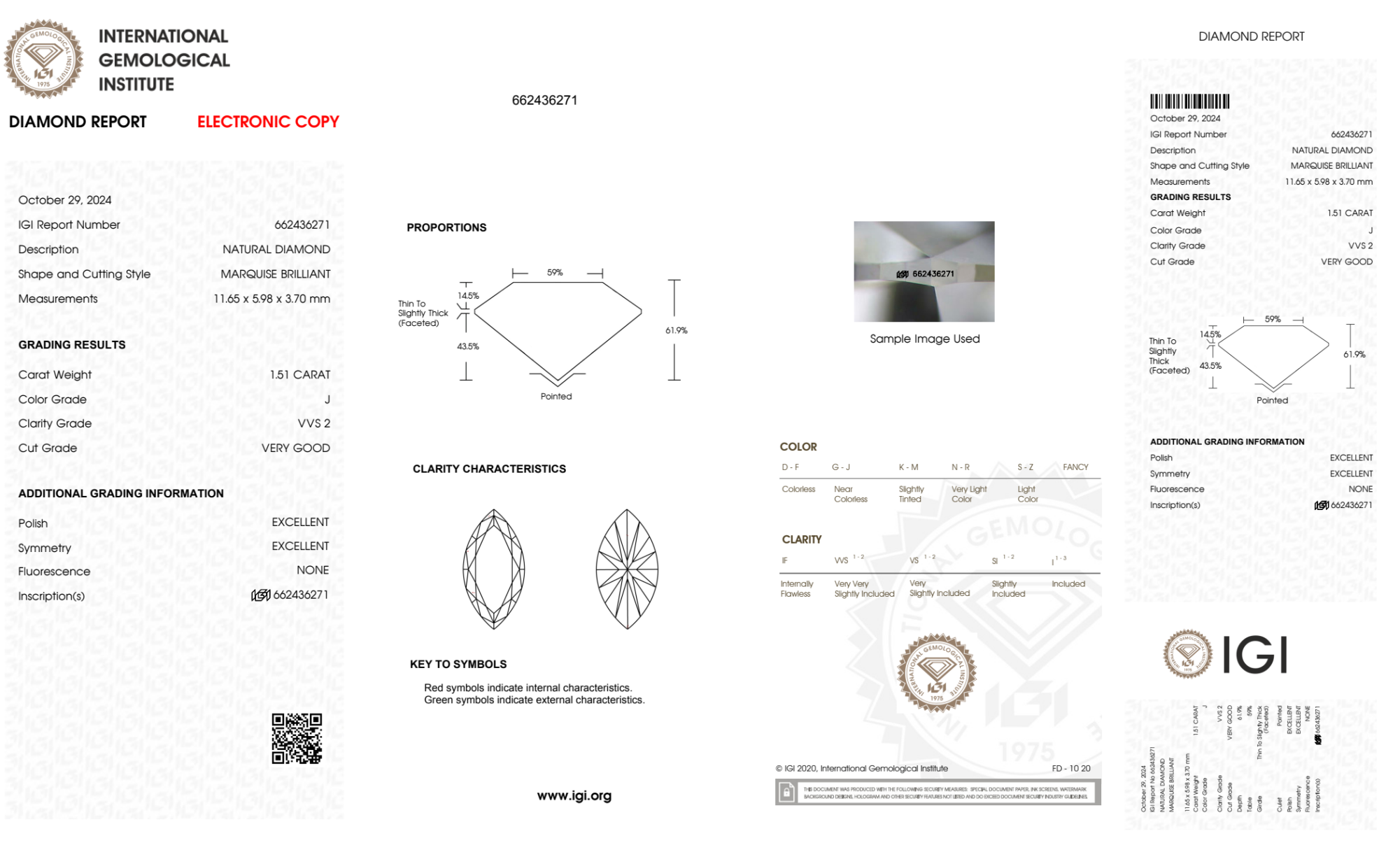 Your 1.51 carat Marquise natural diamond is graded J color (Near Colorless), and you can read more about J color diamonds here.