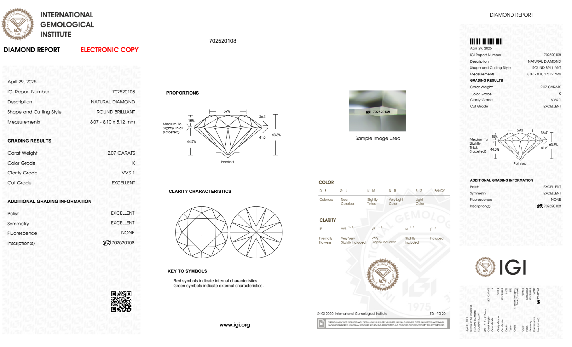Your 2.07 carat Round natural diamond is graded K color (Faint Color), and you can read more about K color diamonds here.