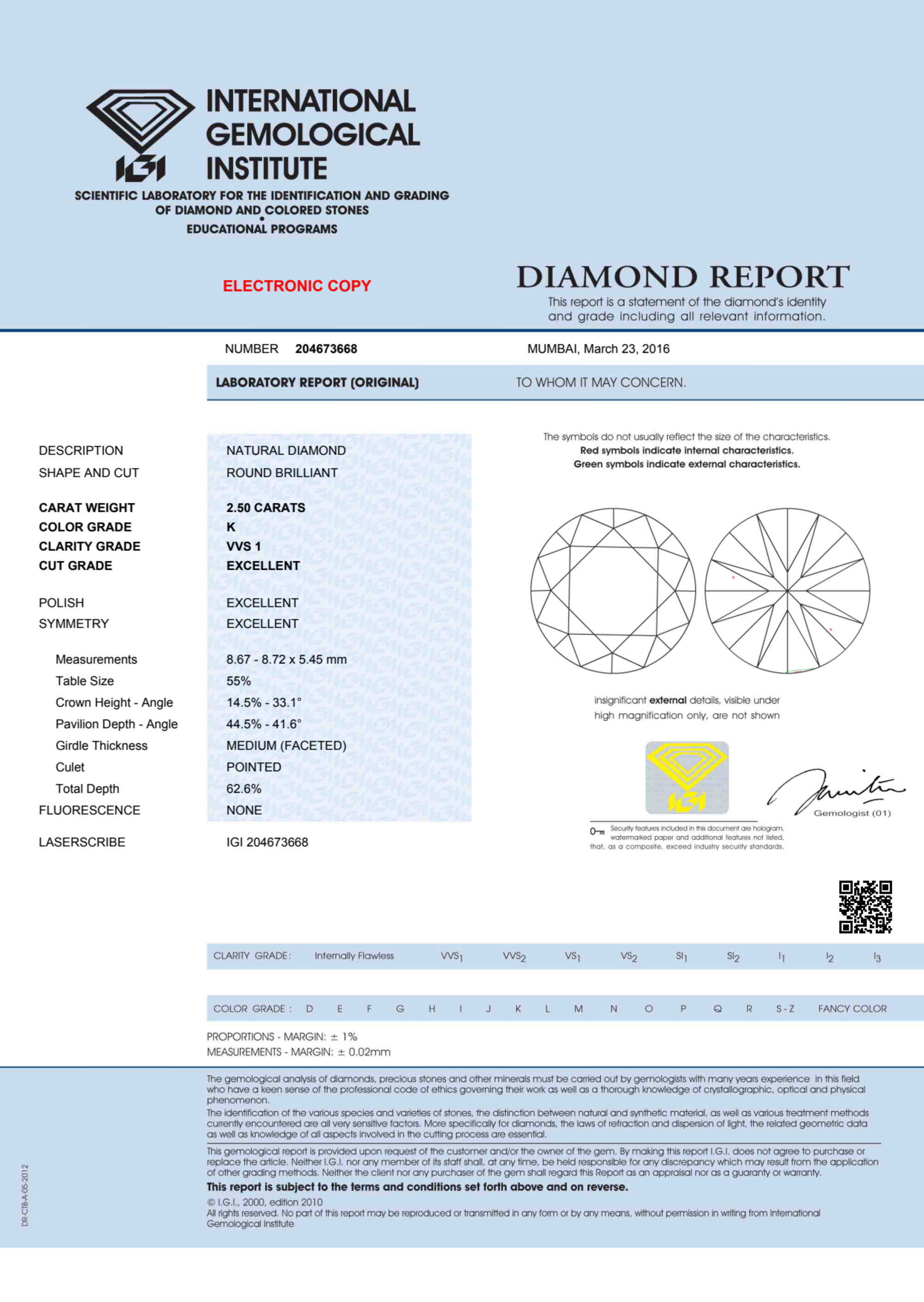 Your 2.50 carat Round natural diamond is graded K color (Faint Color), and you can read more about K color diamonds here.