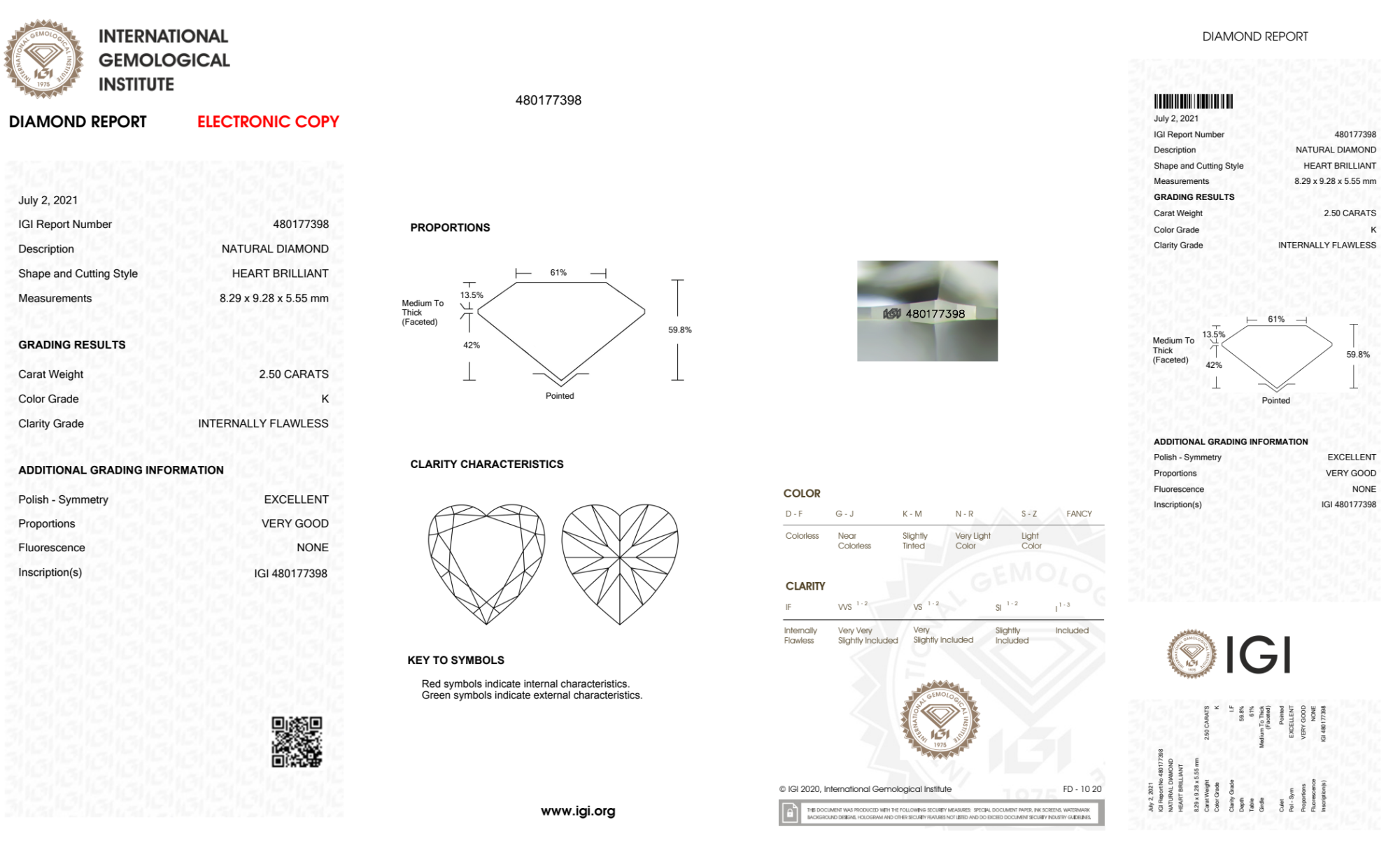 Your 2.50 carat Heart natural diamond is graded IF clarity, which stands for Internally Flawless. Read more about IF clarity diamonds here, or learn more about diamond clarity in general here.