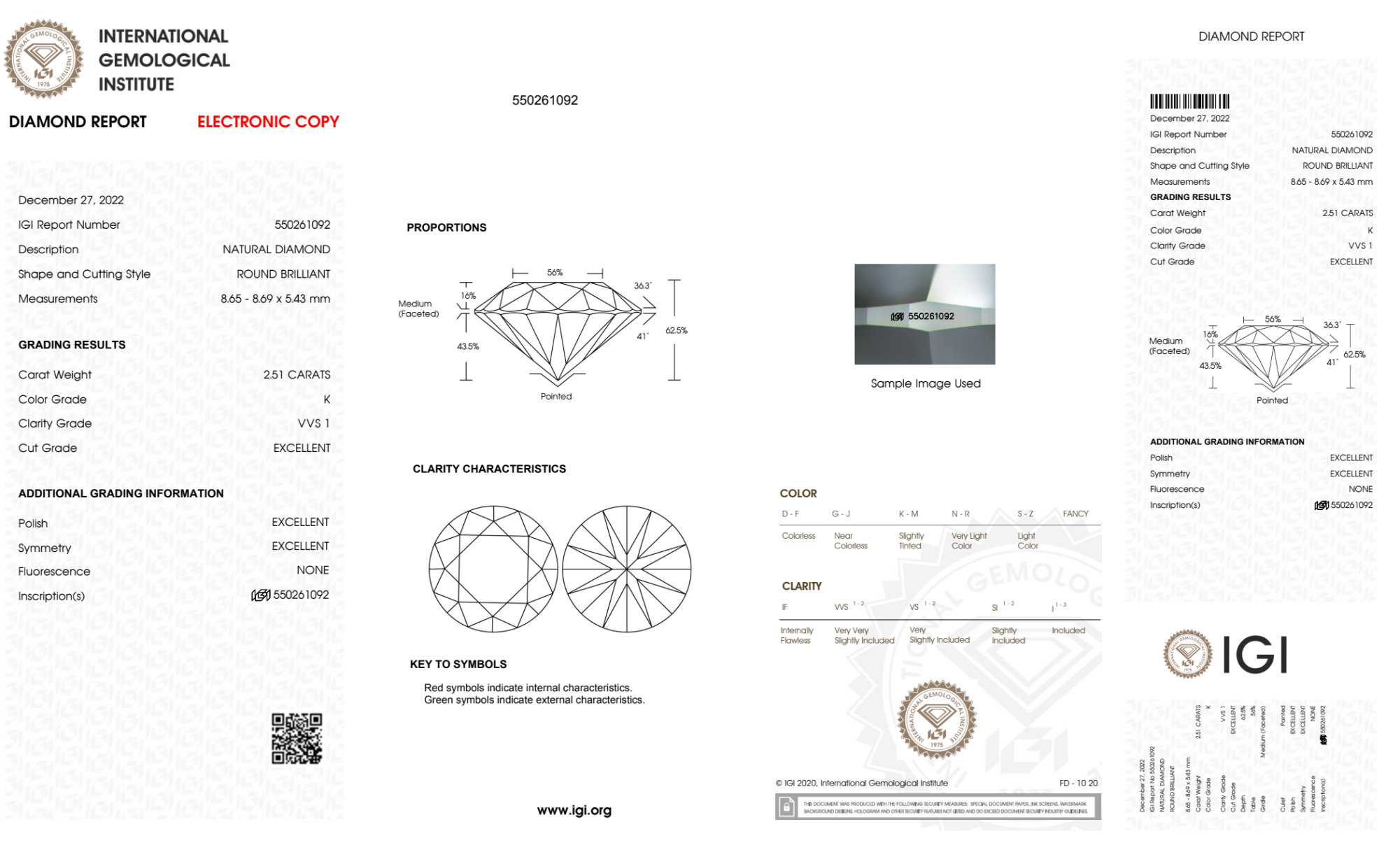 Your 2.51 carat Round natural diamond is graded K color (Faint Color), and you can read more about K color diamonds here.