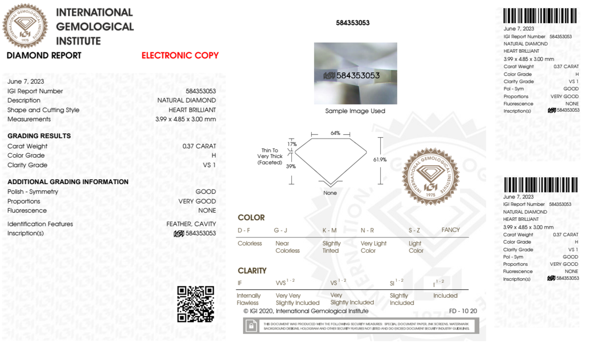 Your 0.37 carat Heart natural diamond is graded H color (Near Colorless), and you can read more about H color diamonds here.